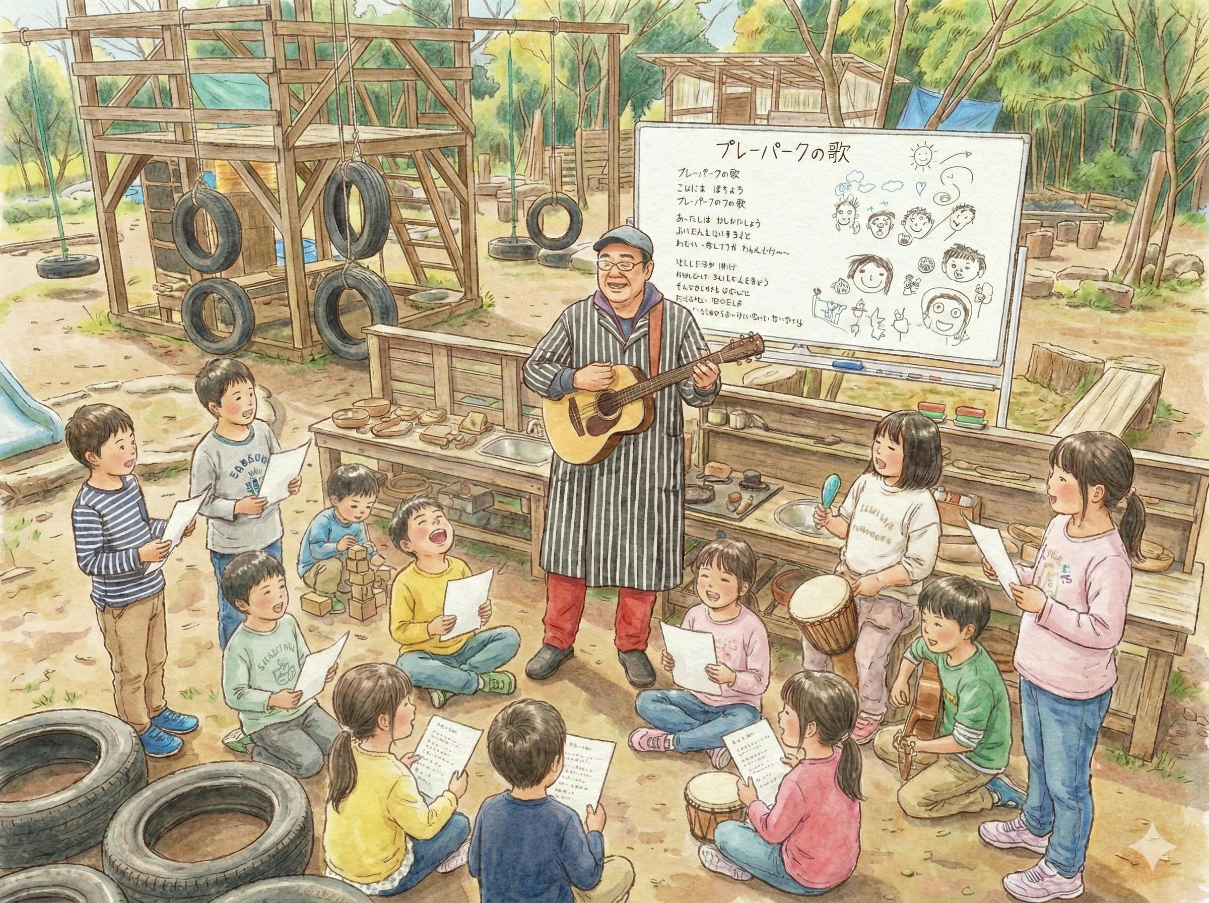 2026年3月30日・31日の2日間、子どもたちと一緒にワークショップを行い、久留米在住のシンガーソングライター・野田かつひこさんと共に「プレーパークの歌」を制作します 。言葉だけでは伝わりにくいプレーパークの意義や「自由な外遊びの大切さ」を、歌の力で社会全体へ発信します 。
