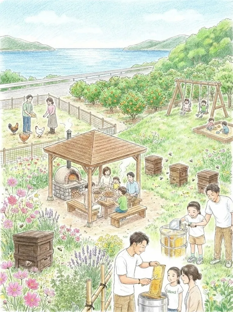 私たちが作りたいのは、体験を通じて自然を知る「学び舎」です。お店の前にあった耕作放棄地を自ら整備し、現在はイチゴハウスや柑橘の果樹園、鶏たちが暮らす豊かな場所へと再生させました。その一角を拠点として、子どもから大人まで、誰もが気軽に養蜂や自然の営みに触れられる場を整えます。