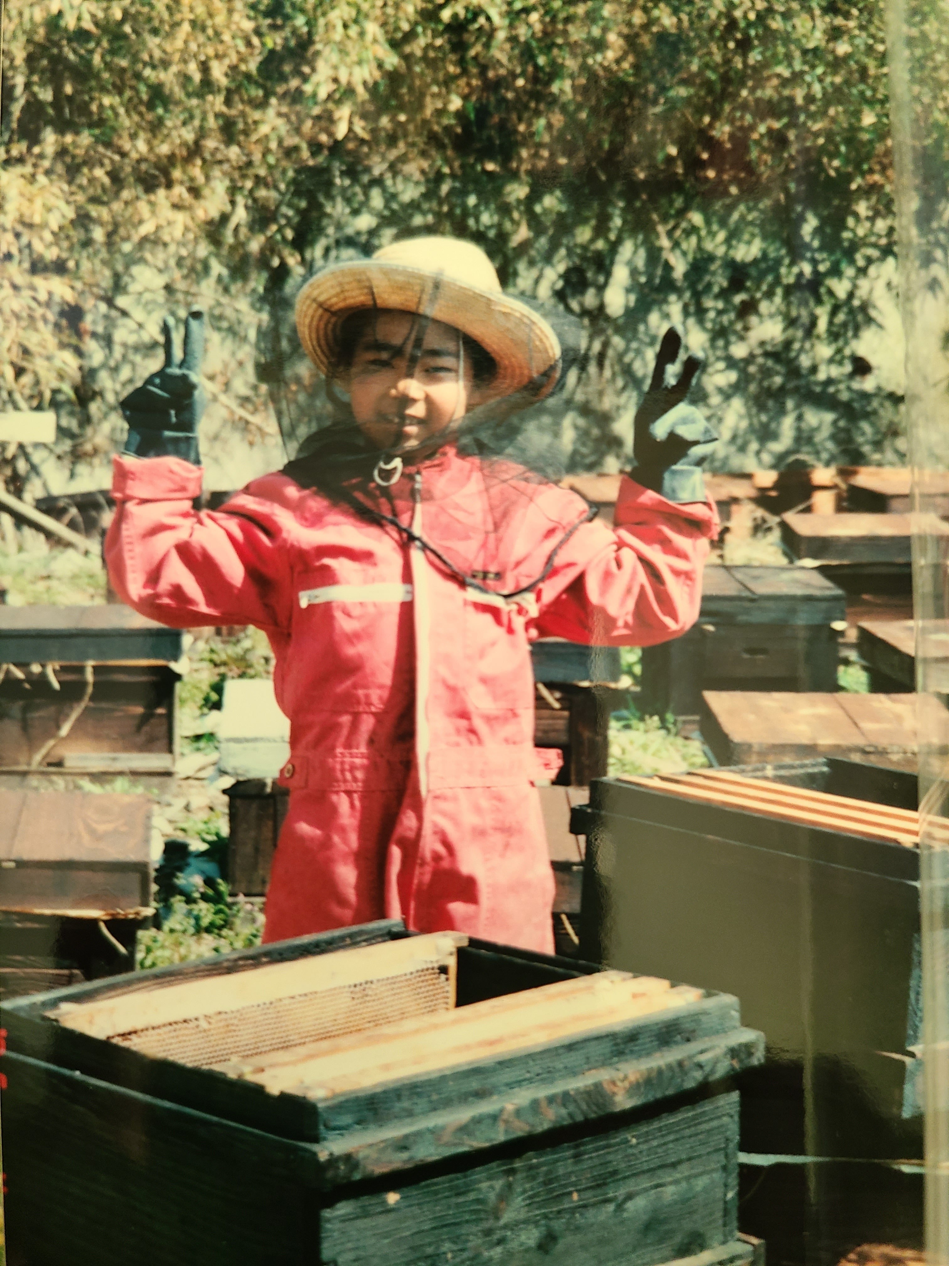 遊び場はいつも養蜂場で、巣箱の上を飛び跳ねて遊ぶ日々。どこにいてもミツバチがいて、私にとっては大切な遊び相手であり家族のような存在でした。この原体験が、今の私の根源にあります。