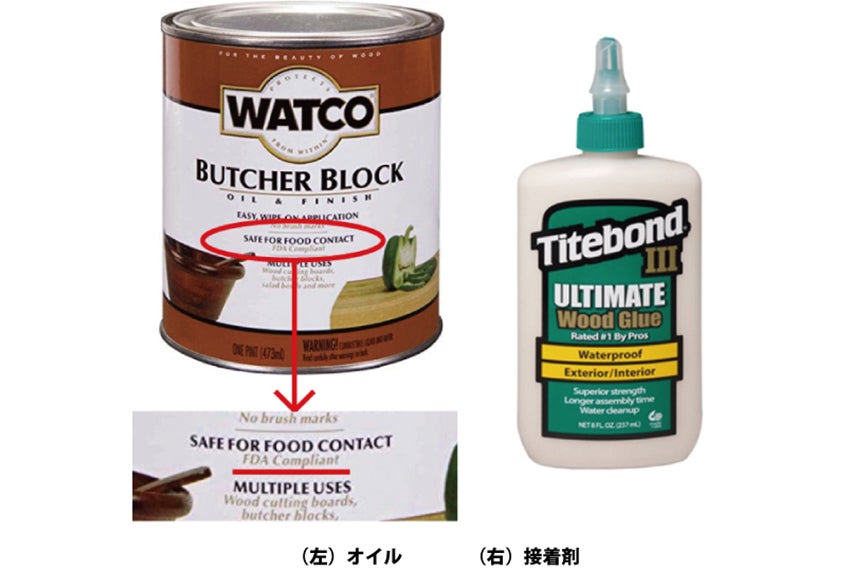 木材の調理台、まな板、サラダ皿などの食器にも使用できるほど安全な無毒性資材です。