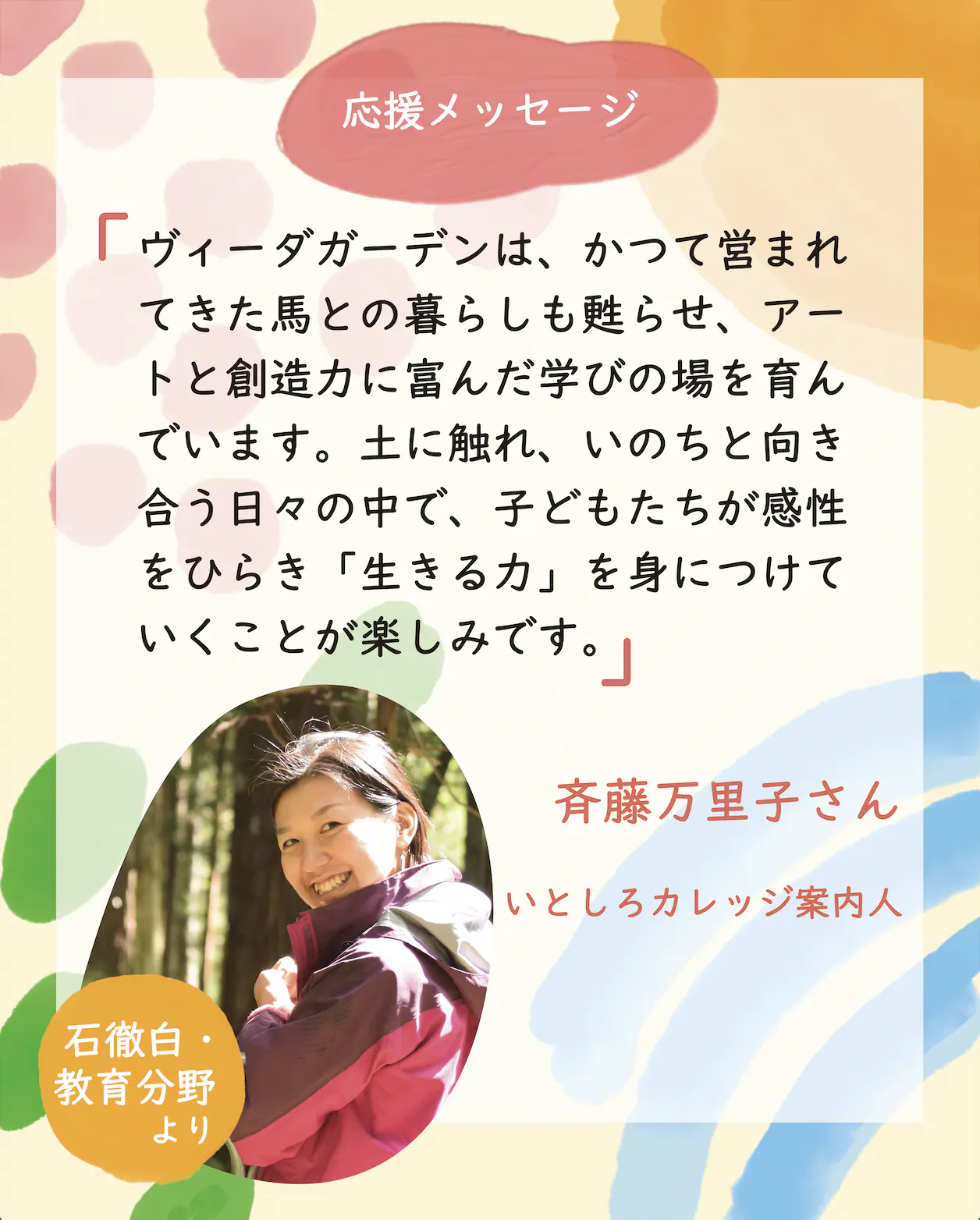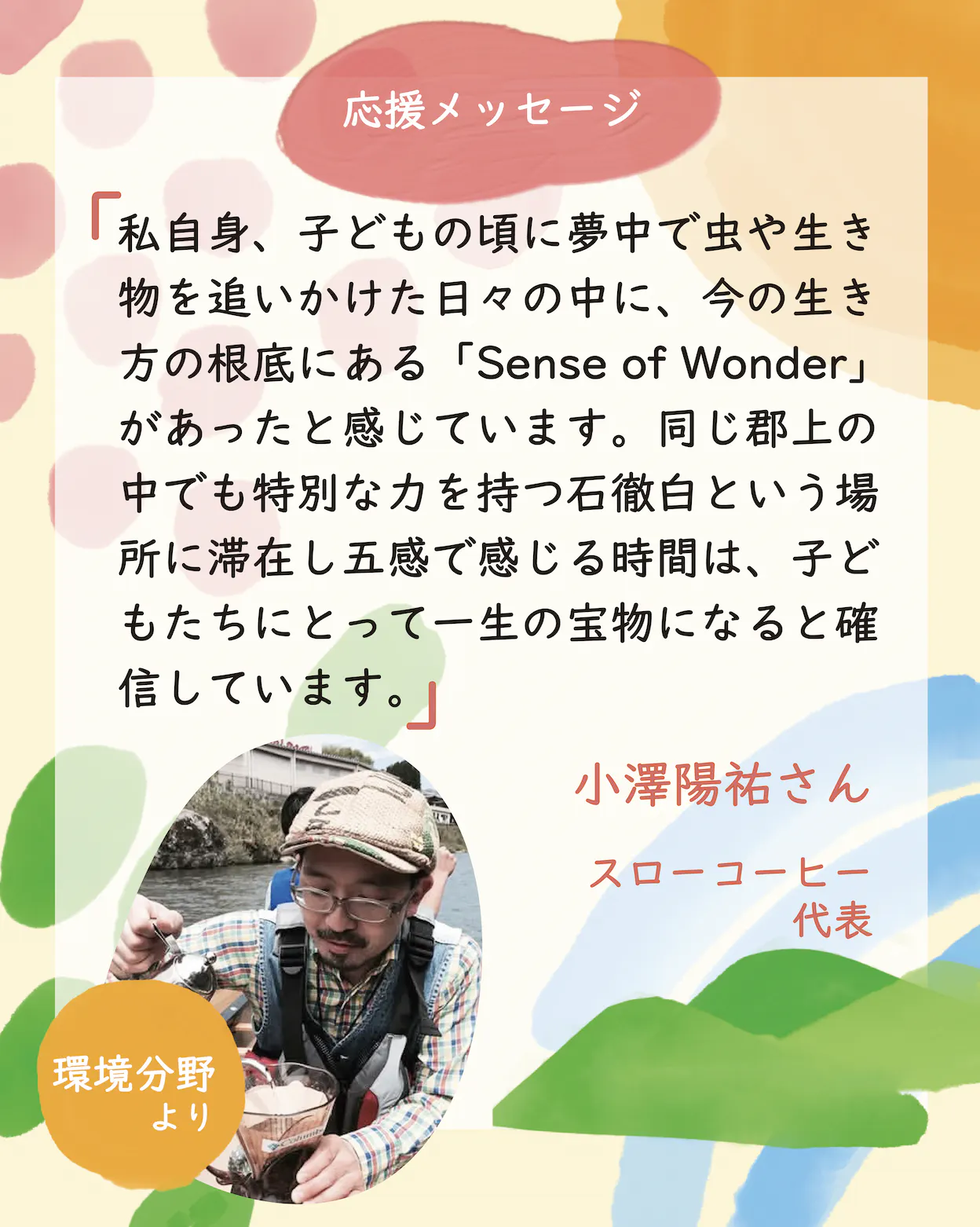 応援メッセージ同じ郡上に住む、小澤陽祐さん(スローコーヒー代表)からメッセージをいただきました。小澤さんは、フェアトレード、オーガニック、自家焙煎にこだわるコーヒーロースター「SlowCoffee」を運営されています。けんぴと小澤さんとの出逢いは、寺田本家(江戸時代に創業し、千葉県香取郡神崎町で、蔵住みの微生物で酒づくりをする)のお蔵フェスタで。香苗と小澤さんとの出逢いは、働いていたKURKKU FIELDS(クルックフィールズ)でのイベントで。それぞれ別々のところで出逢い、郡上でまた再開した小澤さん。2人にとって、それぞれのふたりを知っている貴重な存在で。自然体にいられる小澤さんのお店でのコーヒー時間。それは、小澤さんが細部まで大事にするフェアトレード、オーガニック、自家焙煎のかたちから現れる優しさのような気がします。そんな小澤さんからのメッセージをぜひ、読んでもらえたら幸いです。◉小澤陽祐さん(スローコーヒー代表)「自分の好きなことや得意なことを通じて、自然や環境と繋がっていく。ヴィーダガーデンのふたりが大切にしているこの視点は、持続可能な未来を創るための『真実』だと感じています。私自身、子供の頃に夢中で虫や生き物を追いかけた日々の中に、今の生き方の根底にある『Sense of Wonder』があったと感じています。だからこそ、同じ郡上の中でも特別な力を持つ石徹白という場所に滞在し五感で感じる時間は、子どもたちにとって一生の宝物になると確信しています。子どもたちが伸び伸びと、本来の自分として成長できる『家』をアップデートするこのプロジェクト。今の時代に生きづらさを感じている一人として、そして郡上へ移住した仲間の一人として、彼らの活動を誇りに思い、心から推薦します!」小澤陽祐さん(おざわ ようすけ)スローコーヒー代表========== ========== ==========