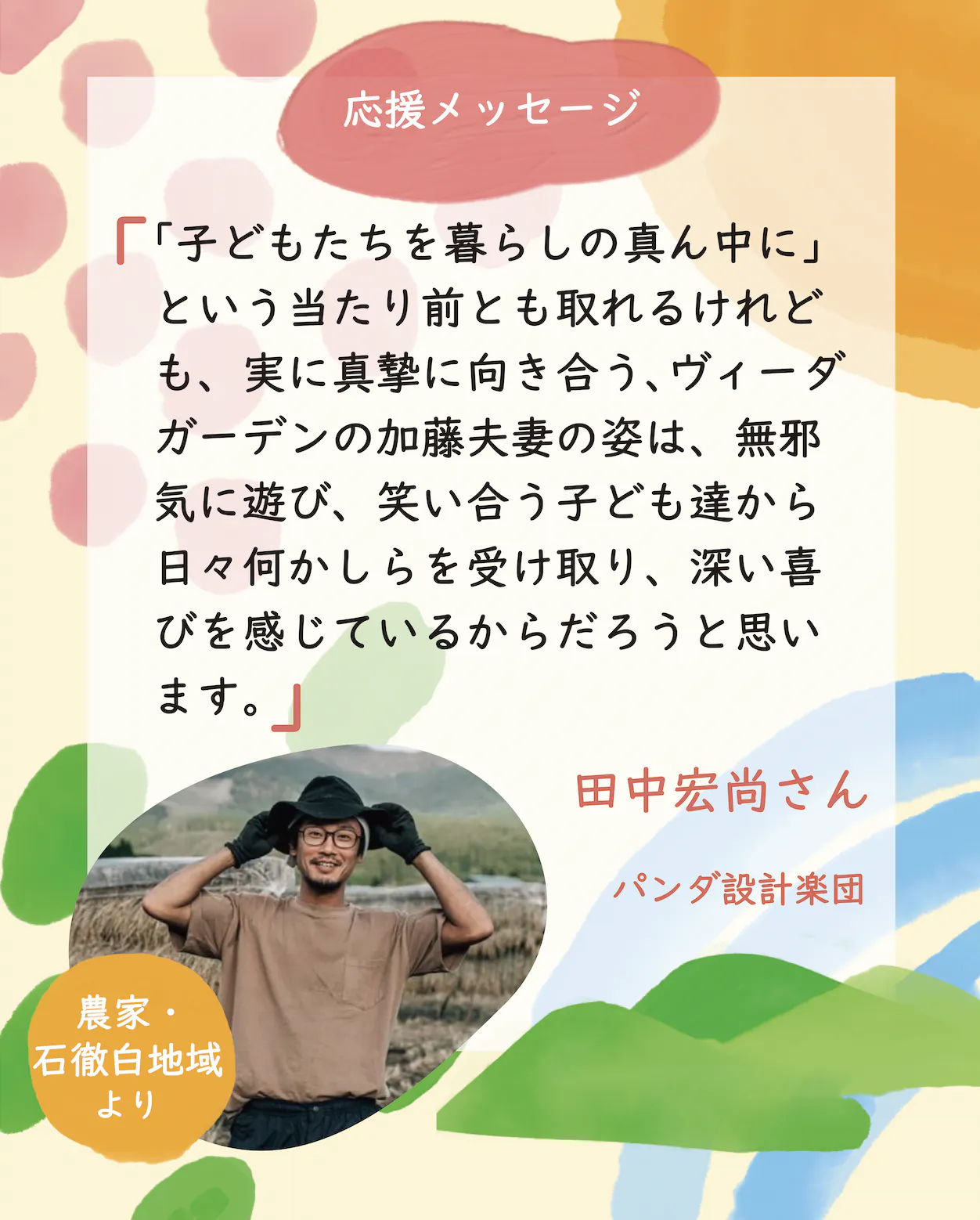 応援メッセージ石徹白の大好きな先輩、田中宏尚(たなか ひろたか)さんから応援メッセージをいただきました。ひろさんは、お米の自然栽培農家です。集落営農をする「里守耕舎」のボスもしていて、ぼく(けんぴ)も一緒に石徹白の田んぼでお米づくりをしています。3児の父でもありながら、農家として石徹白の風景をつくり、風景を生きている姿は、とてもかっこよく、自分が石徹白で馬耕や馬搬をやり、石徹白の風景をつくっていきたい。と思う感覚を支えてくれる1人です。そんなひろさんからのメッセージは、とてもリアリティに溢れ、熱い気持ちになります。ぜひ、読んでいただけると幸いです。◉田中 宏尚(たなか ひろたか)さんからの応援メッセージ「文化が残り、豊かな自然に囲まれた別天地での生活。そんな甘い言葉に反し、200名そこそこの小さな集落で自分達の思い描く暮らしを営んでいくというのは、そう簡単な事ではありません。ヴィーダガーデンの加藤夫婦はそんな険しい道のりを、しなやかに、健やかに、そして着実に進めていく、そんな逞しさを持った方達です。「子どもたちを暮らしの真ん中に」という当たり前とも取れるけれども、実に真摯に向き合う姿は、無邪気に遊び、笑い合う子ども達から日々何かしらを受け取り、深い喜びを感じているからだろうと思います。そんな彼らと接すると、自分まで温かい気持ちになります。今回のクラファンは、彼らの実現したい未来への後押しと共に、喜びのエネルギーを伝播させ、共に暮らす私たちをも豊かにしていく、そんな壮大なプロジェクトだと思っています。是非皆さんも「里山暮らしの中で、自分自身をのびやかに育む教育拠点を作る」という彼らの想いにご協力ください。」田中 宏尚(たなか ひろたか)パンダ設計楽団========== ========== ==========引き続き、応援、SNSシェアのご協力をお願いします!クラファンまで残り、13日…最後まで走り切ります!