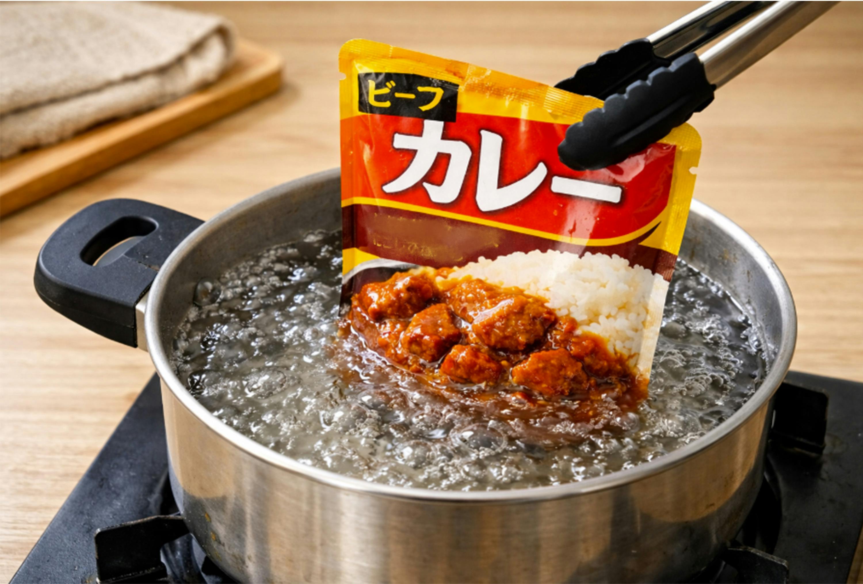 レトルト食品は、一見簡単そうに見えて、実は意外と手間がかかります。まず鍋に水を入れ、お湯を温めて沸騰させてからレトルトを入れる・・・