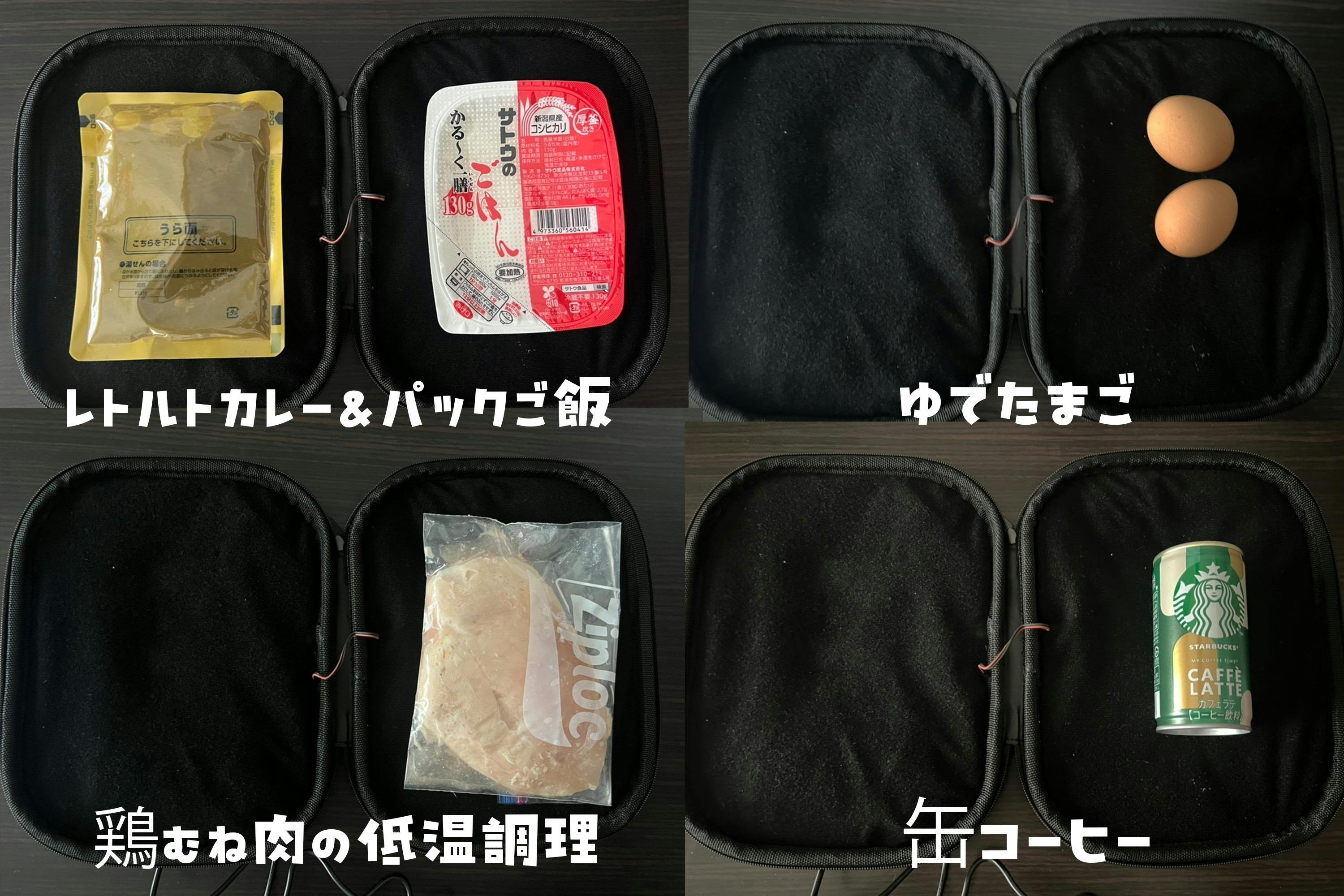レトルト食品、飲み物(缶コーヒーなど)、ゆで卵、鶏むね肉の調理、ウエットティッシュの保温など、工夫次第でさまざまな用途に対応します。