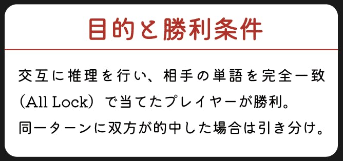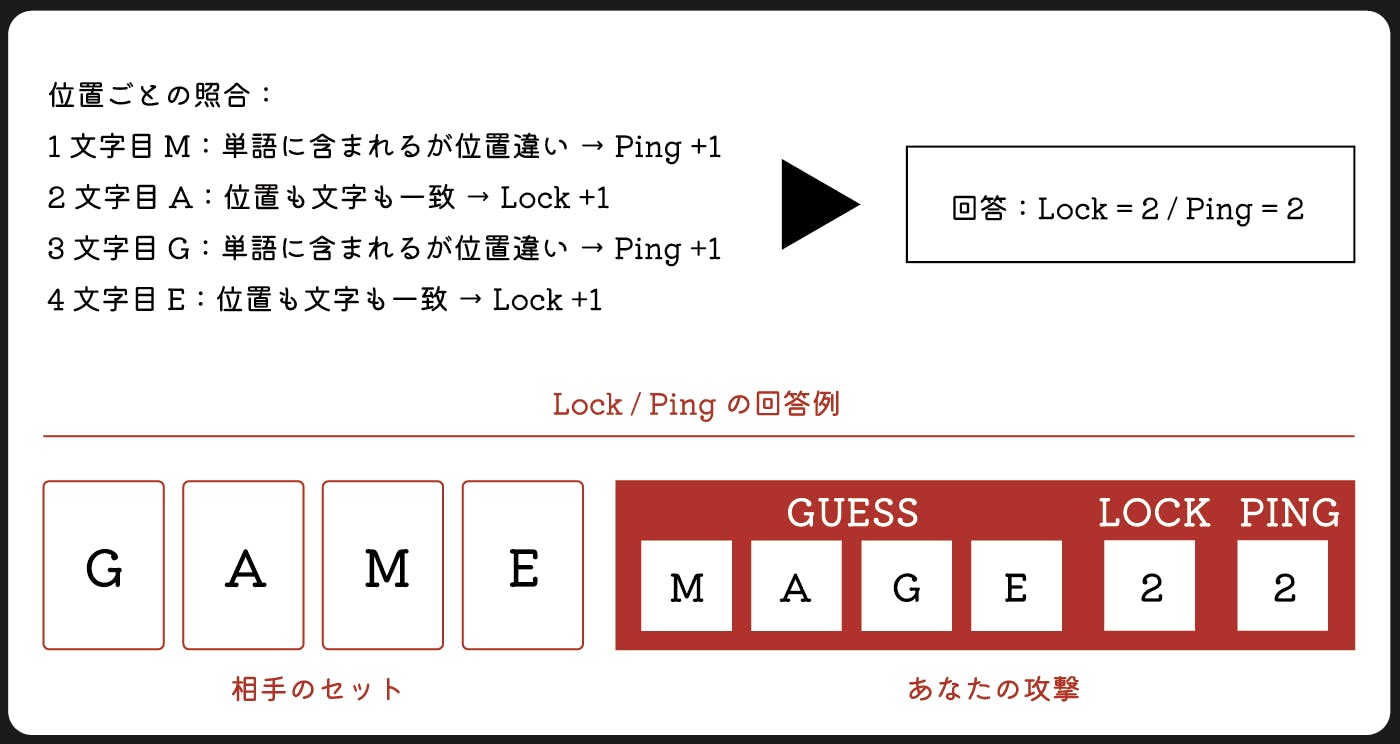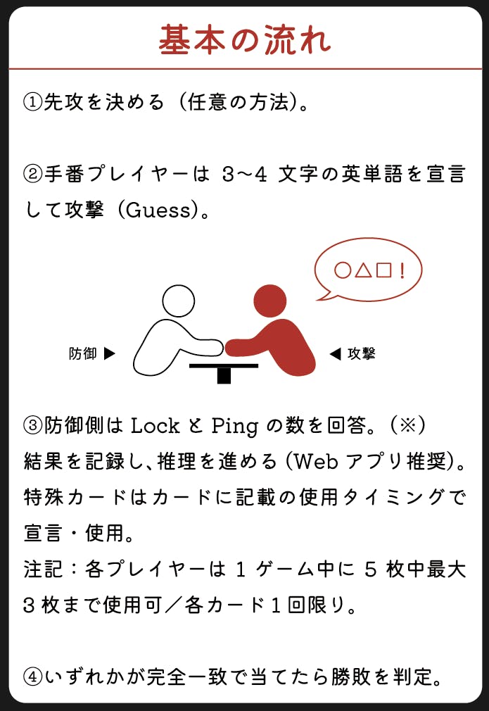 交互に攻撃と防御を行います。カードに英単語を記入し、相手の単語を推測。相手は推測された単語に対して「Lock(文字と位置が一致) 」と「Ping(文字は含まれるが位置が異なる)」の数を教えます。