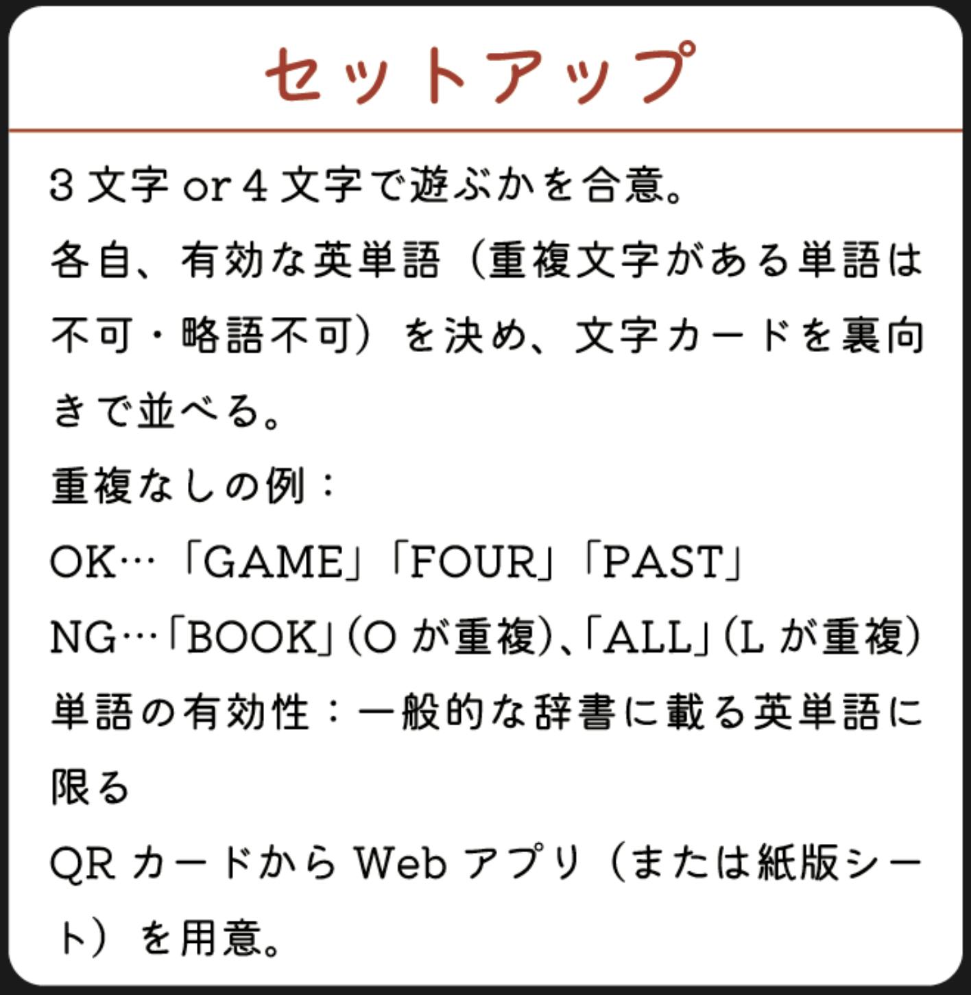 各プレイヤーは自分の知っている英単語を1つ決め、文字カードを裏向きに並べてセットします!
