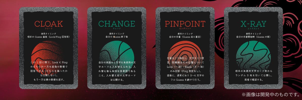 クラシックな数理推理ゲーム『NumberOn』の構造をベースにしつつ、特別な攻撃ができる特殊カードなどを採用し、英単語の語彙力とロジカルな推理戦に重きを置いた頭脳派ゲームに完成させました!