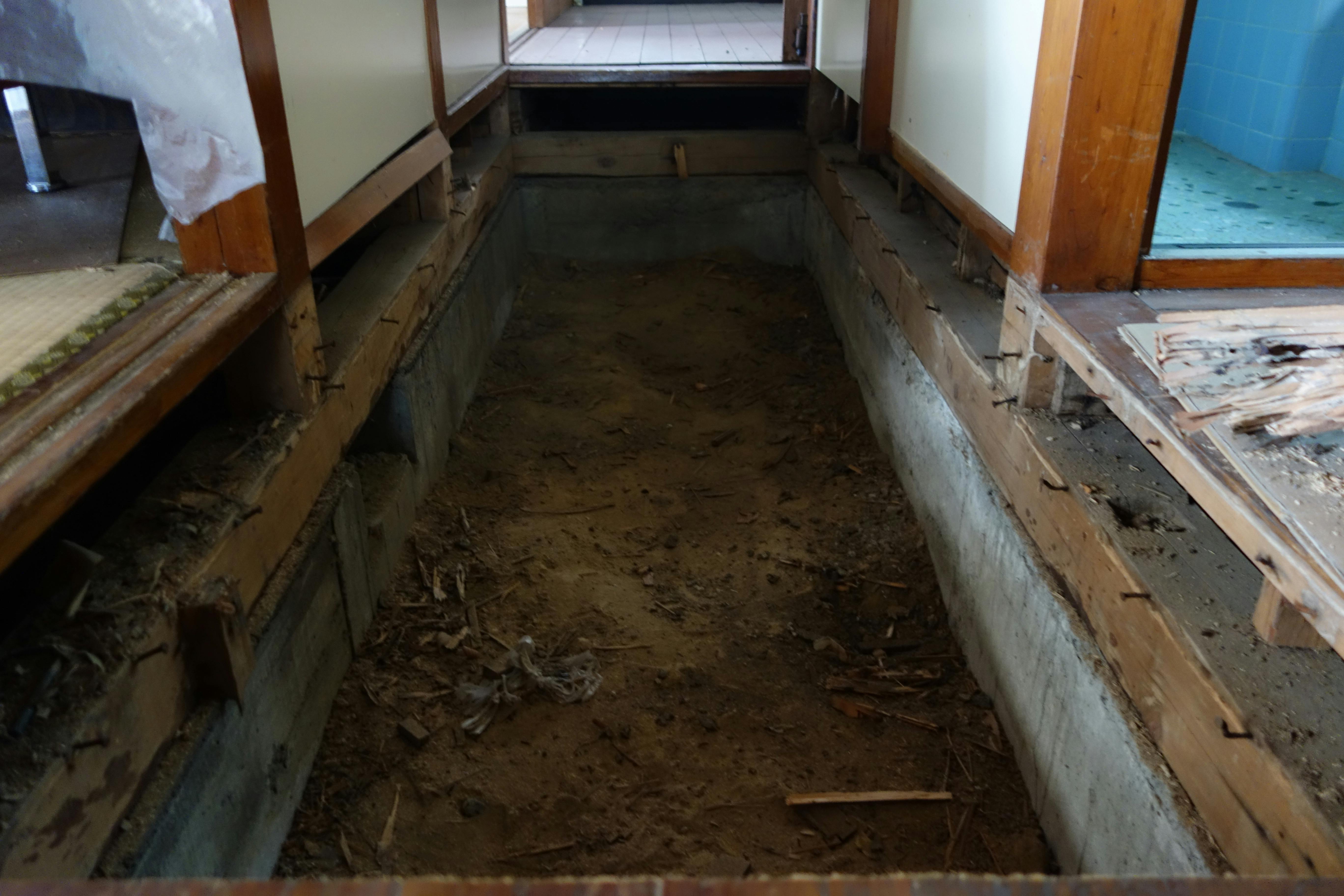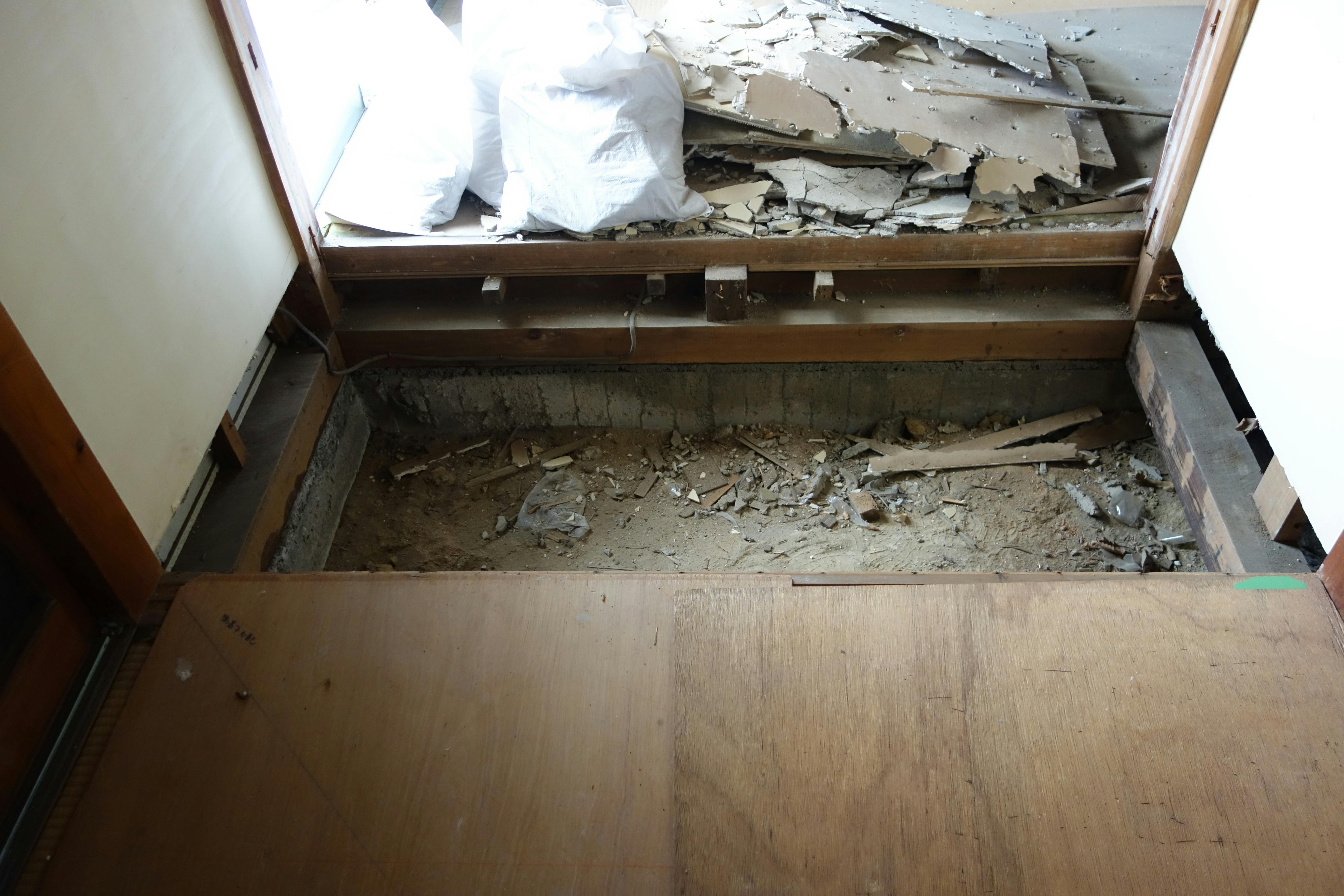 こちらは契約時に既に床が抜けていましたので、工事必須でした。風呂場が隣にあり、湿度で木材が腐ったところをシロアリに食べられ、被害に遭っていました。不幸中の幸いだったのは、被害が想定よりも広がっていなかった事です。