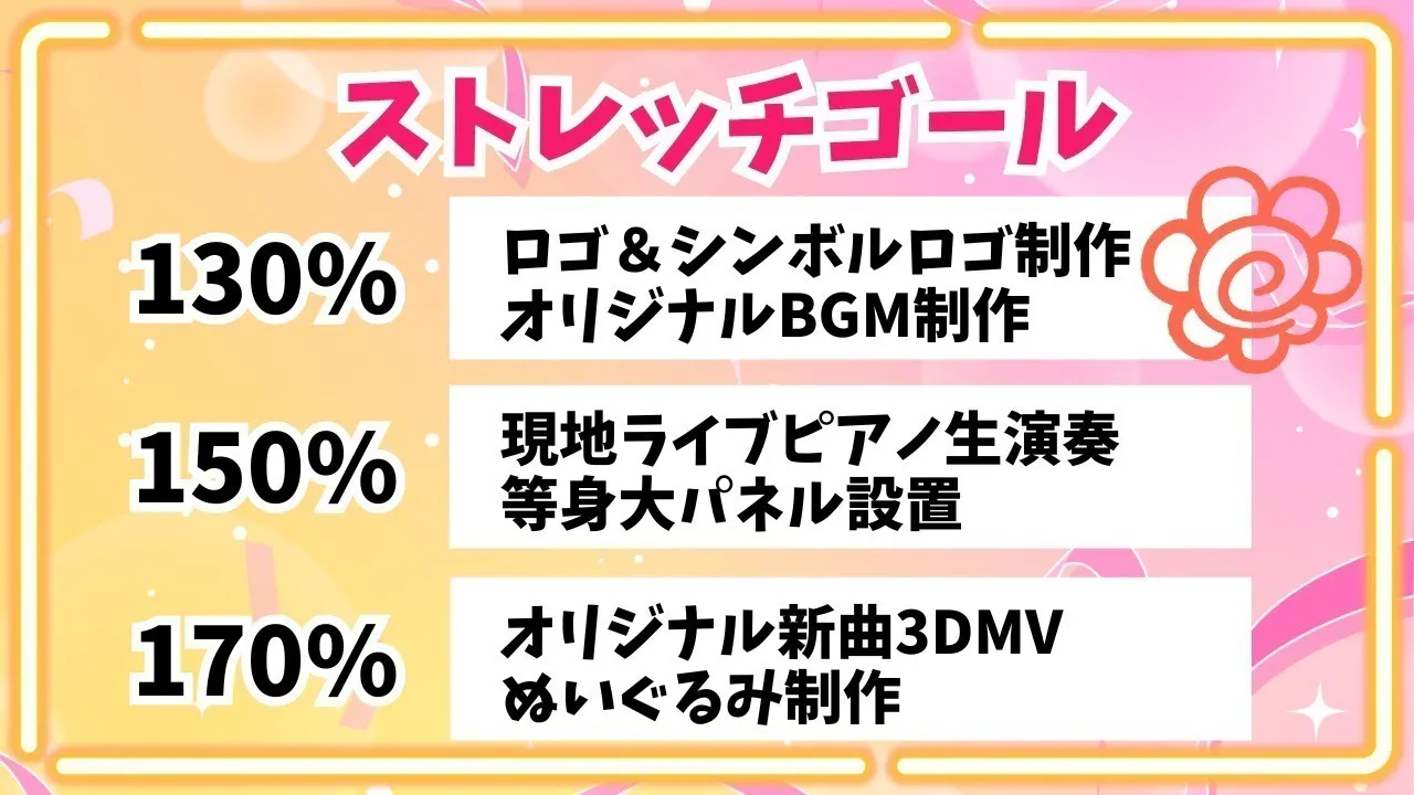 ・3D新衣装制作 ・3D素体制作 ・お披露目ライブスタジオ代 ・ライブハウス代 ・現地フルトラッキングスタジオ代 ・ライブ制作人件費 ・新衣装デザイン代 ・キービジュアル制作費 ・グッズ製作費 ・送料 ・クラファン手数料