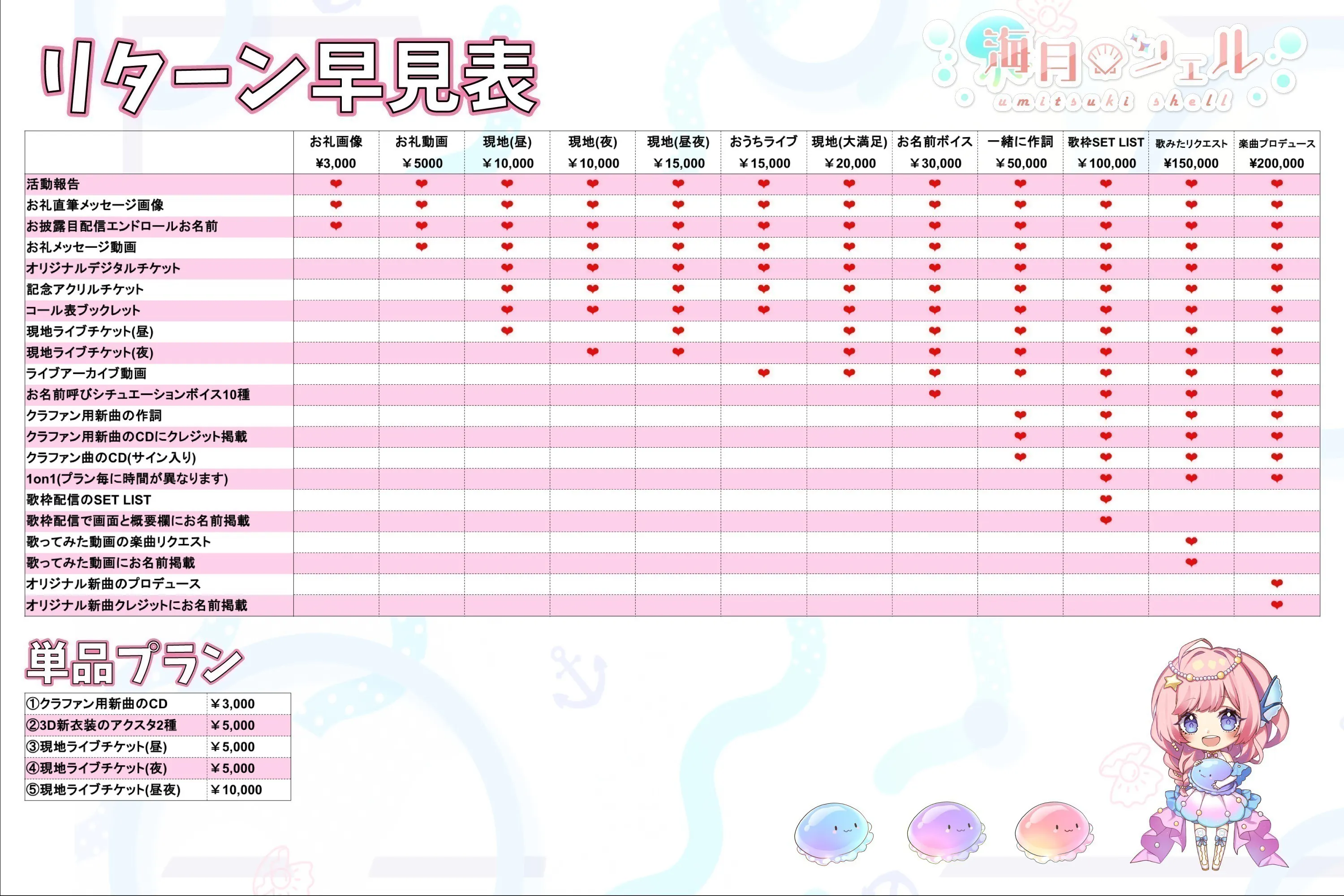 【歌枠SET LIST】歌枠SET LIST全部決めプラン(10人限定) ・活動報告 ・お礼直筆メッセージ画像 ・お披露目配信エンドロールお名前(6/30お披露目配信にて記載) ・お礼メッセージ動画(約5分間) ・現地ライブチケット(昼夜) ・オリジナルデジタルチケット(優先入場番号付き) ・記念アクリルチケット ・コール表ブックレット ・ライブアーカイブ動画(昼夜) + ・お名前呼び一言シチュエーションボイス10種※1 ・歌枠配信のSET LISTを決められます(15曲まで)※4 ・歌枠配信で画面と概要欄にお名前掲載させて頂きます ・クラファン用新曲の作詞を1フレーズをご提供頂き、それを海月シェルがまとめて1曲に仕上げます※2 ・クラファン用新曲のCDにクレジット記載 ・クラファン用新曲のCD(サイン入り)※3 ・1on1(10分) ※1 お名前呼びで「おはよう」「おやすみ」「お疲れ様」「いつもありがとう」「お誕生日おめでとう」「頑張って」「いってらっしゃい」「おかえりなさい」「ただいま」の9種+ご希望のシチュエーション1種(内容は相談させてください。)の全10種を収録してお届け。 ※2 海月シェルがテーマを決めて1フレーズ考えてもらいます。内容によってはご相談させてください。 また、こちらの指定期限までにご提出がない場合はクレジット記載のみとなります。 ※3 リターン品の著作権及びその他法的権利については、すべてプロジェクトオーナーに帰属します。 ※4 海月シェル歌えるリストから選んでください。1曲だけリストにない曲でも「カラオケ歌っちゃ王」か「生音風カラオケ屋」、「カラオケDAM」にカラオケがある楽曲ならリクエスト可能。 ★備考欄にエンドロールに掲載を希望するお名前をご記入ください。 ★チケット有効期限:2026年7月25日(土)当日限り