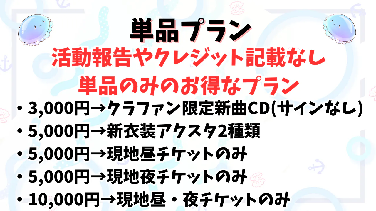 今回は新衣装と現地ワンマンライブのプロジェクトになるので、新衣装のアクスタや、現地チケット、現地に行けない方もおうちでライブプランや、シェルと一緒に曲作りなどの体験型プラン、またCDやアクスタなどは単品でもご用意したので、それだけ欲しい!もしくはグッズはあまりいらない!にも対応できるようにいろいろ考えました!