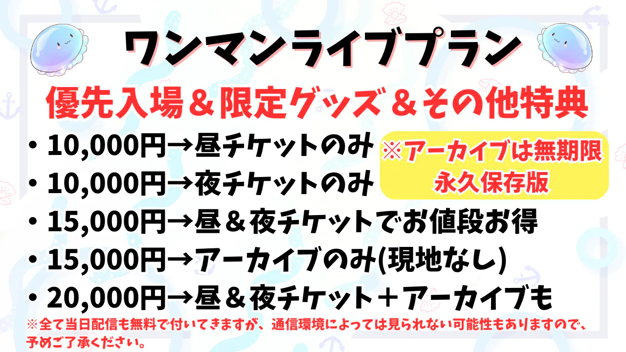 ※現地に行く方は値段がお得な昼・夜15,000円のプランか、永久保存版のアーカイブ動画が付いてくる20,000円のプランがオススメ!現地に行けない方は15,000円のアーカイブのみプランをご購入下さい!