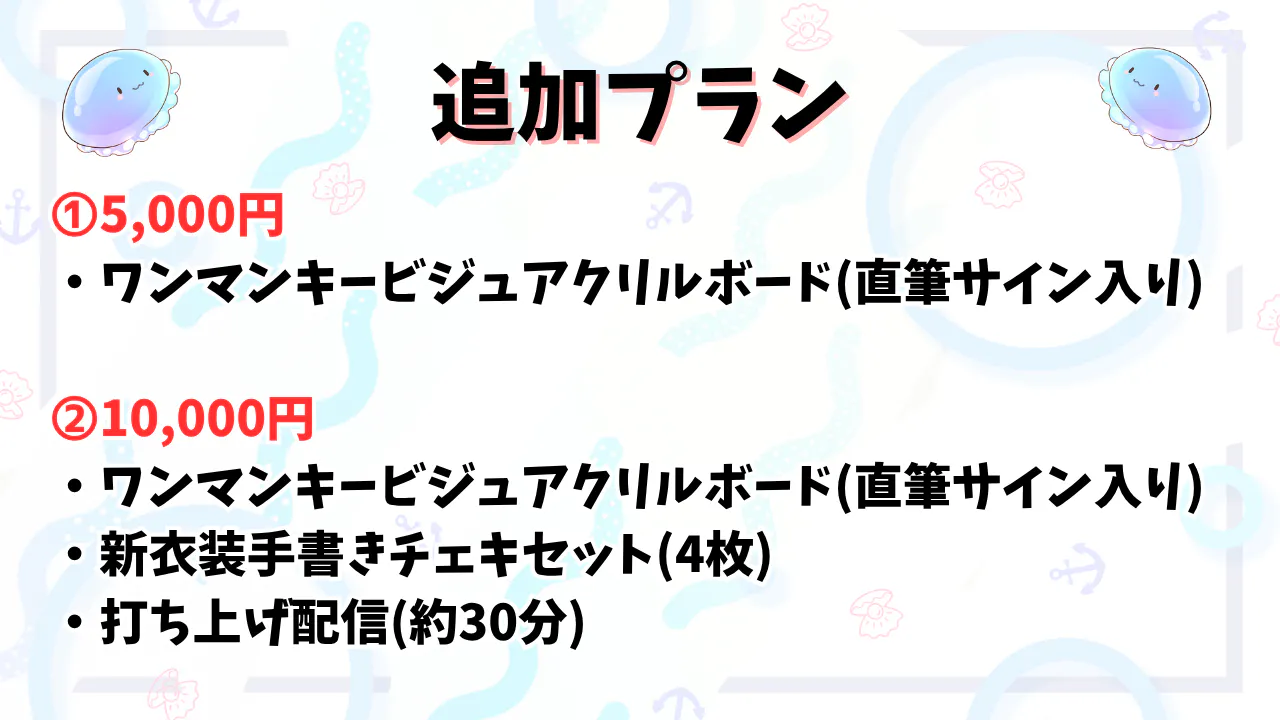| ¥100,000 | 歌枠SET LIST全部決めプラン | 10 |