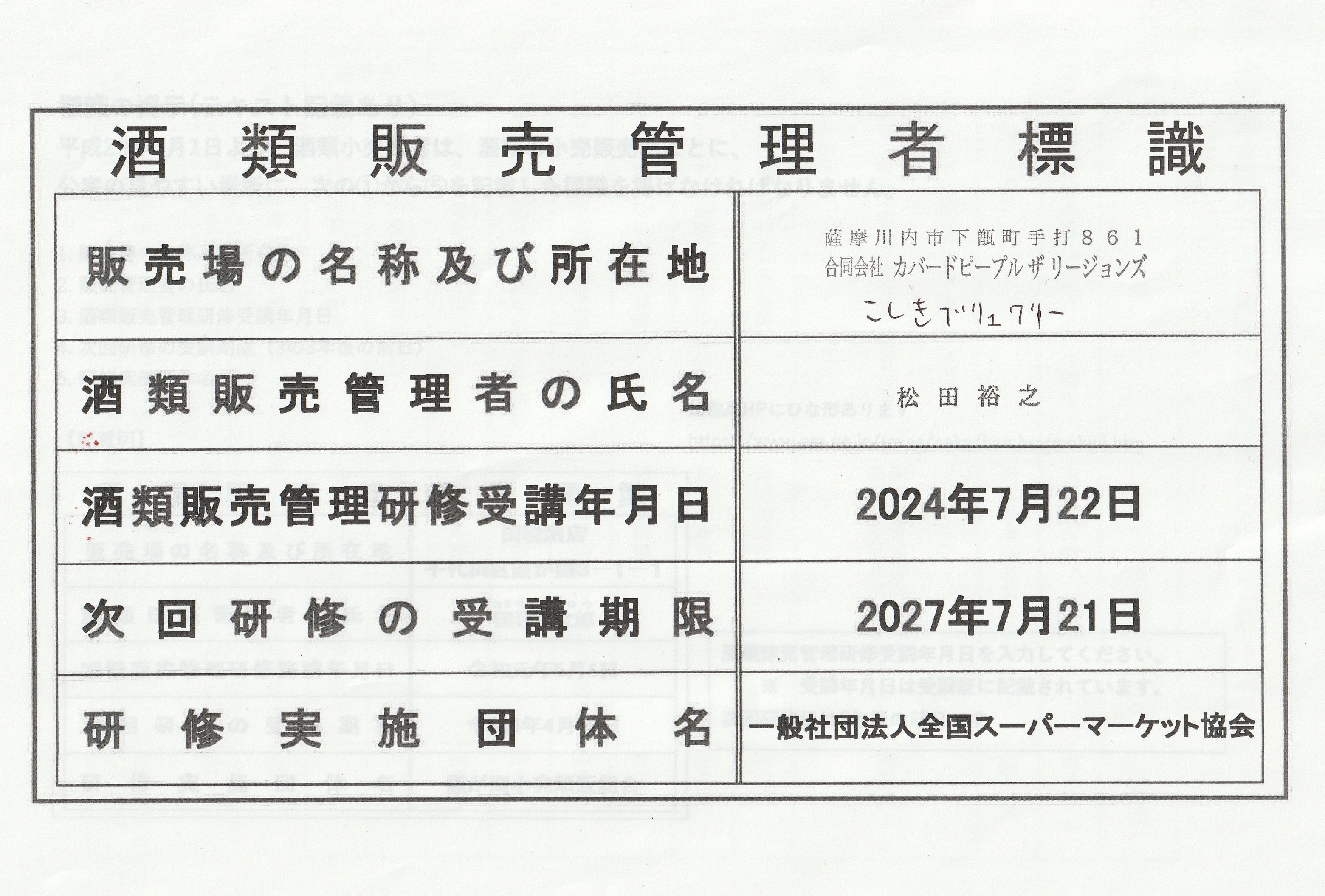 酒類販売管理研修受講者標識の掲示