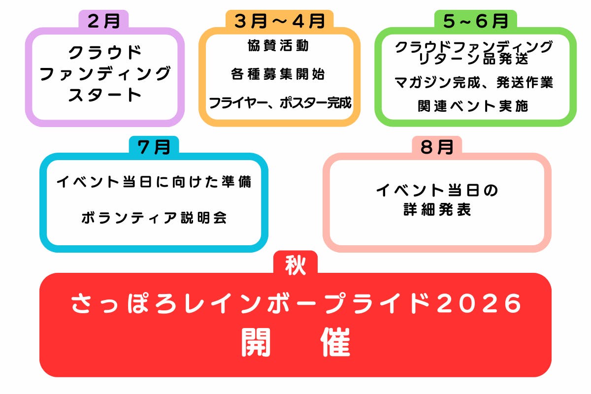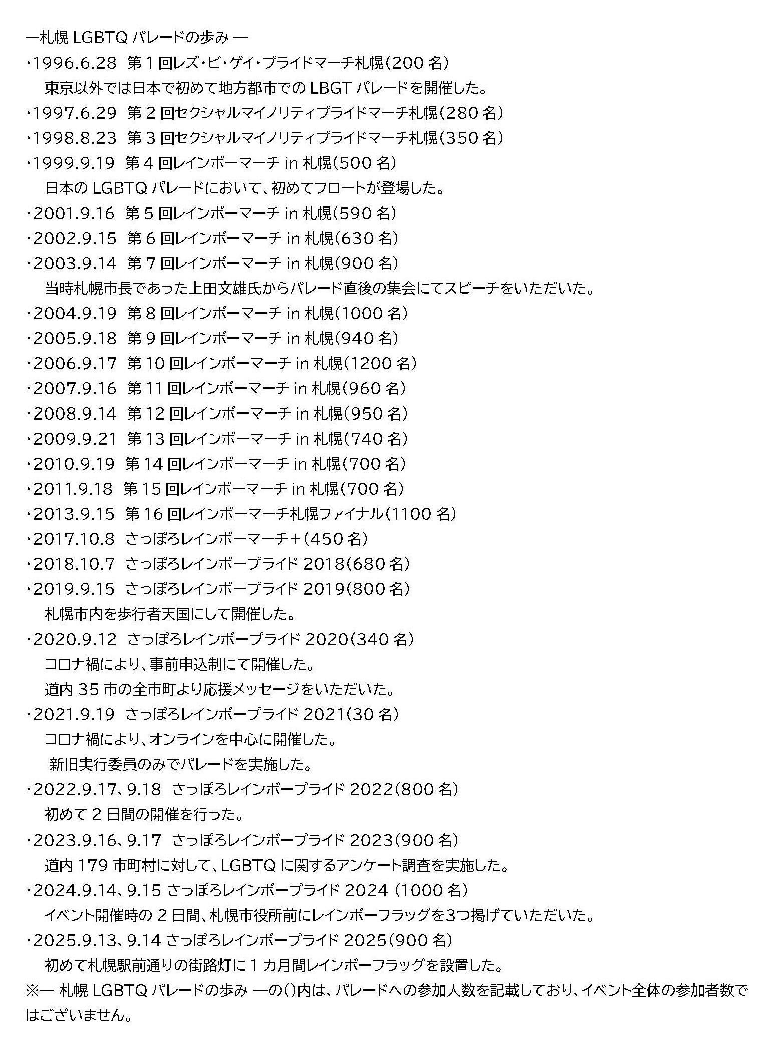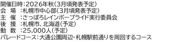 ※悪天候、地震、伝染病等の不測な事態によって、やむなくイベントが変更または中止となる場合があります。イベントが変更または中止される場合は、公式ホームページ(さっぽろレインボープライド)にてお知らせいたします。