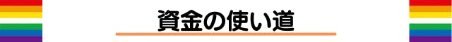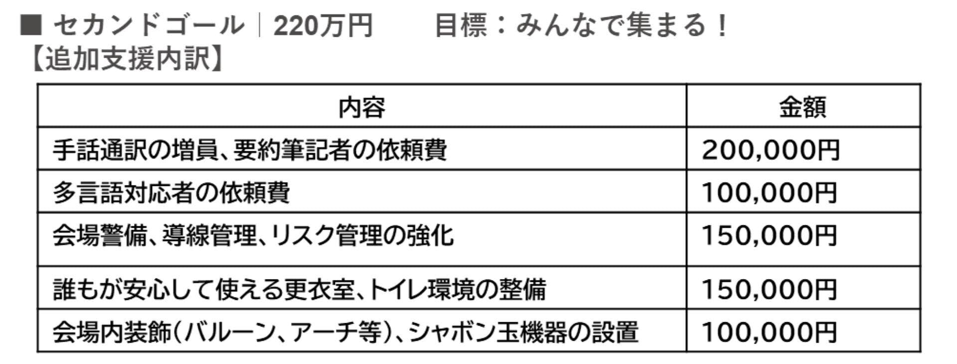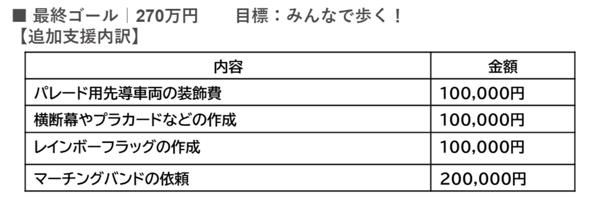 • 会場・道路使用料、警察等手続 会場設営費 パレード用先導車両レンタル、装飾代 簡易ステージ・最低限音響 保険・最低限警備 手話通訳の増員、要約筆記者の依頼費 多言語対応者の依頼費 会場警備、導線管理、リスク管理の強化 誰もが阪神して使える更衣室、トイレ環境の整備 会場内装飾(バルーン、アーチ等)、シャボン玉機器の設置 横断幕やプラカードなどの作成 レインボーフラッグの作成 マーチングバンドの依頼(交通費)