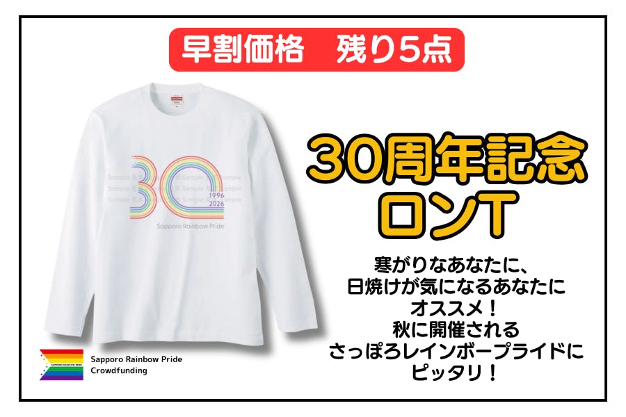 1996年から札幌で続いてきたプライドパレード。この歩みを未来へつなぎ社会を変えていくために!私たちは今年もさっぽろレインボープライドの開催を目指し、クラファンに挑戦します!「あなた」の参加が誰かの力となり、「私たち」が歩くことで社会は動き出します。1人でも多くの人と、この街で「さぁ歩こう!」