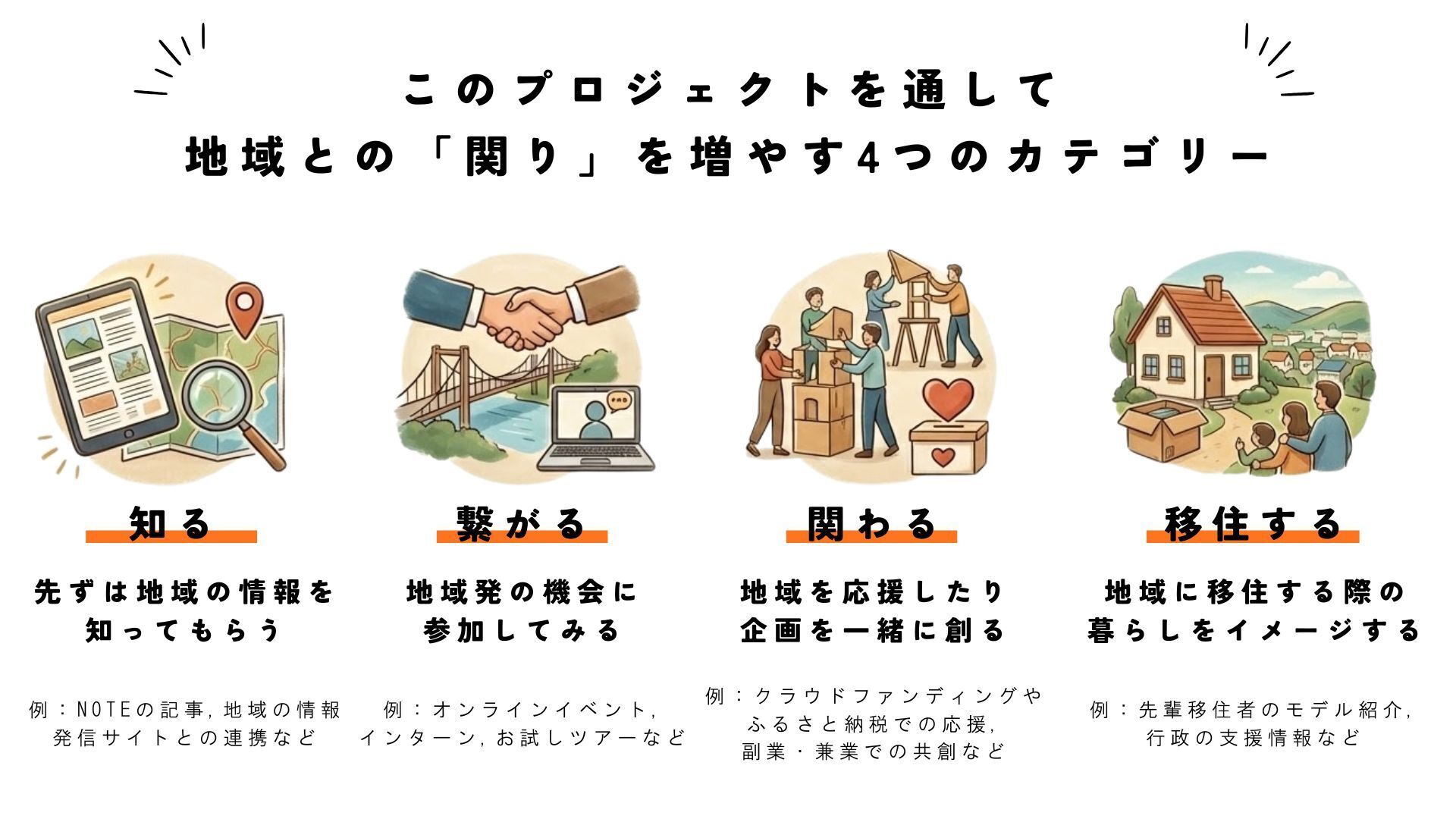 地域との関りをつくるために、「知る」「繋がる」「関わる」「移住する」の4つのカテゴリーで情報を発信します。閲覧者が多様な機会に興味を持ち、現地訪問やオンライン応援など、多様な選択肢の中から自分らしい接点を持てるサイトを目指します。