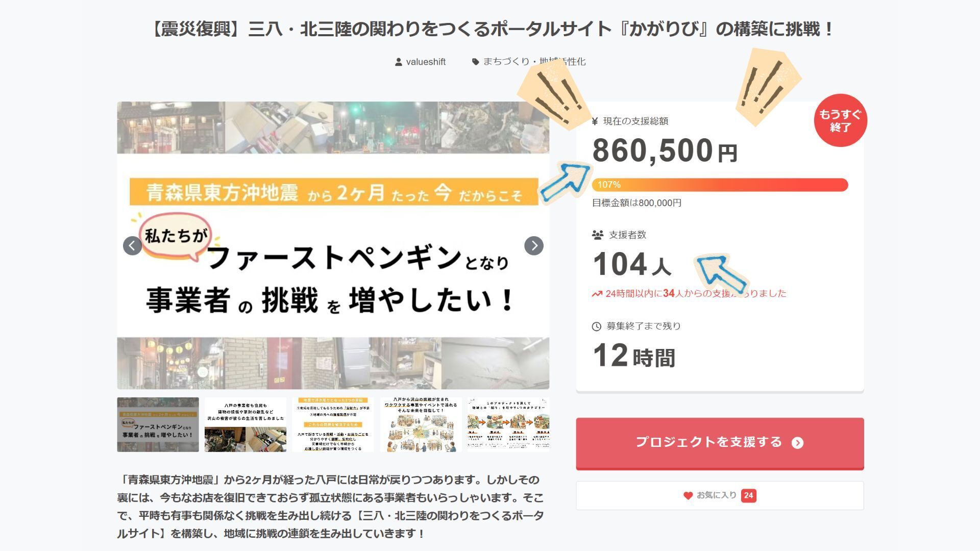 2026/04/01 10:00いつも多大なるご支援と温かい応援をいただき、誠にありがとうございます。 バリューシフト スタッフ一同です。2026年2月10日より挑戦してまいりました、ポータルサイト『かがりび』構築プロジェクトは、3月31日をもちまして無事に募集期間を終了いたしました。最終的に、115名もの皆さまから、目標を大きく上回る909,000円(達成率113%)という多大なるご支援をいただくことができました。皆さまの温かいご協力に、心より感謝申し上げます。正直に申し上げますと、開始当初はこれほど多くの方に支えていただけるとは思ってもみませんでした。ページを更新するたびに届く皆さまからのメッセージに、私たちスタッフがどれほどの勇気をいただいたか計り知れません。「ファーストペンギン」としての第一歩今回のプロジェクトは、昨年末にいただいた打診から始まりました。 震災の影響が残る中、助けを必要としながらも「準備の余裕がない」「支援疲れが心配」と、挑戦を躊躇している地元の同志たちがたくさんいました。「だったら、まずは私たちが先陣を切って道を切り拓こう」そう決意して立ち上がったのが、今回のクラウドファンディングでした。私たちが「ファーストペンギン」として最初に飛び込むことで、メディアや新しい支援の輪を巻き込み、誰もが挑戦しやすい環境をつくりたい。その一心でのスタートでした。その想いは少しずつ形になり、現在、八戸では多くの支援プロジェクトが立ち上がり、今もなお挑戦が続いています。もしよろしければ、この後に続く地域の同志たちの挑戦にも、引き続きお心を寄せていただけますと幸いです。プロジェクトの進捗は「活動報告」で発信し続けます私たちの募集期間は終了しましたが、プロジェクトはここからが本番です。 バリューシフトは、次なるステップである「ポータルサイトの構築」へと本格的に着手いたします。サイトがどのような形で作られていくのか、そして次に続く八戸の挑戦者たちがどのように羽ばたいていくのか。そのプロセスを、今後もこの「活動報告」を通じて定期的にお届けしてまいります。皆さまから託していただいた想いが、どのように地域に還元され、新しい連鎖を生んでいくのか。その行く末をぜひ最後まで見守っていただければ幸いです。この「挑戦と応援の連鎖」を絶やさぬよう、私たちはこれからも走り続けます。 皆さまと繋がれたこのご縁を大切に、一歩ずつ進んでまいります。改めまして、この度は本当にありがとうございました!2026年4月1日バリューシフト スタッフ一同 もっと見る