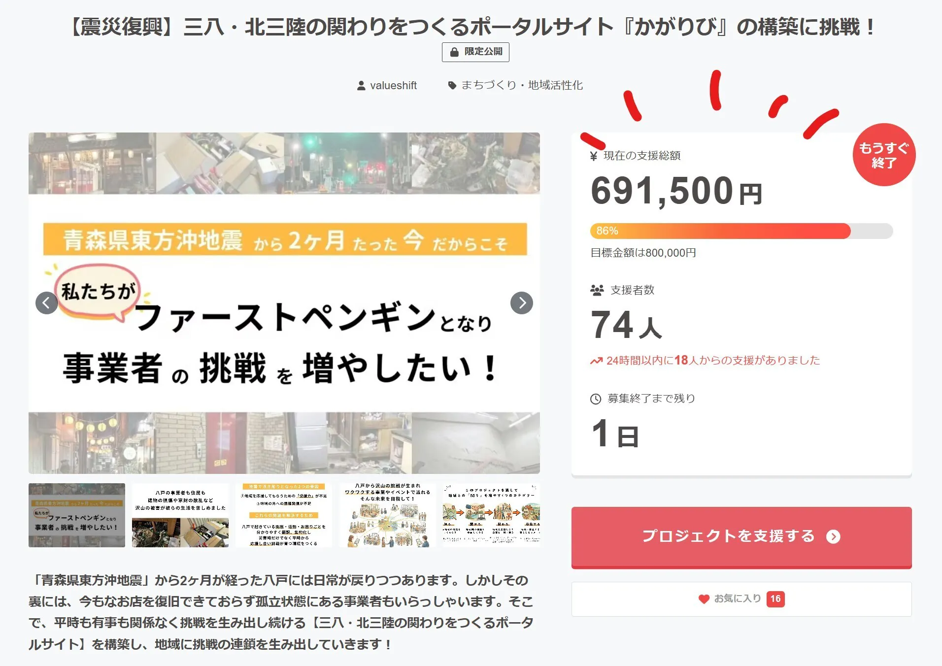 しかし、現実は青森県東方沖地震に対する民間・公的な支援はその範囲や期間が限られており資源は限定的です。さらに、限られた資源も時間の経過とともに減少していくのが現実です。だからこそ、中長期的かつ継続していくためには、民間の力を活かした持続的に資源を繋ぎ続ける仕組みが必要です。その答えの一つとして、能登で数々のマッチングを促進してきたクラウドファンディングの集約サイトを、三八・北三陸エリアに最適化し、クラファンだけでなく、地域のあらゆる情報を可視化できるような、地域発のポータルサイトを立ち上げることを決めました。