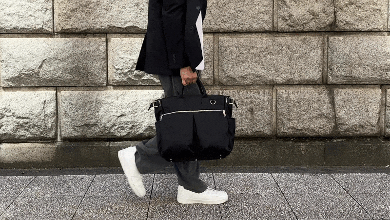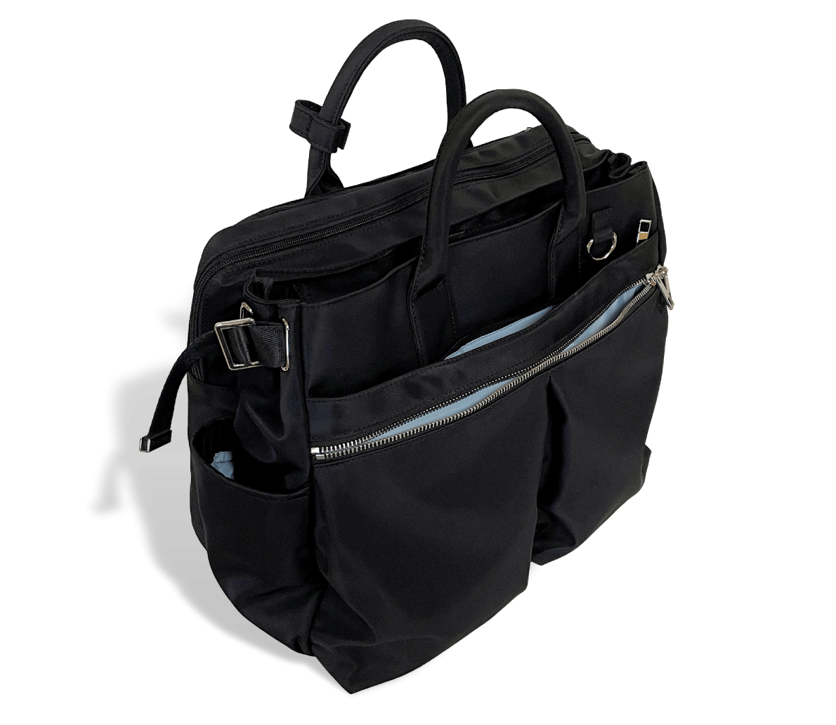 バッグのメイン収納(3層目と4層目)は、マイボトルなど私物を入れる大容量スペースと、ブリーフケースのように書類やPCを保護して収められるビジネス向けスペースの2層構造。用途に合わせてすっきり分別して収納できます。