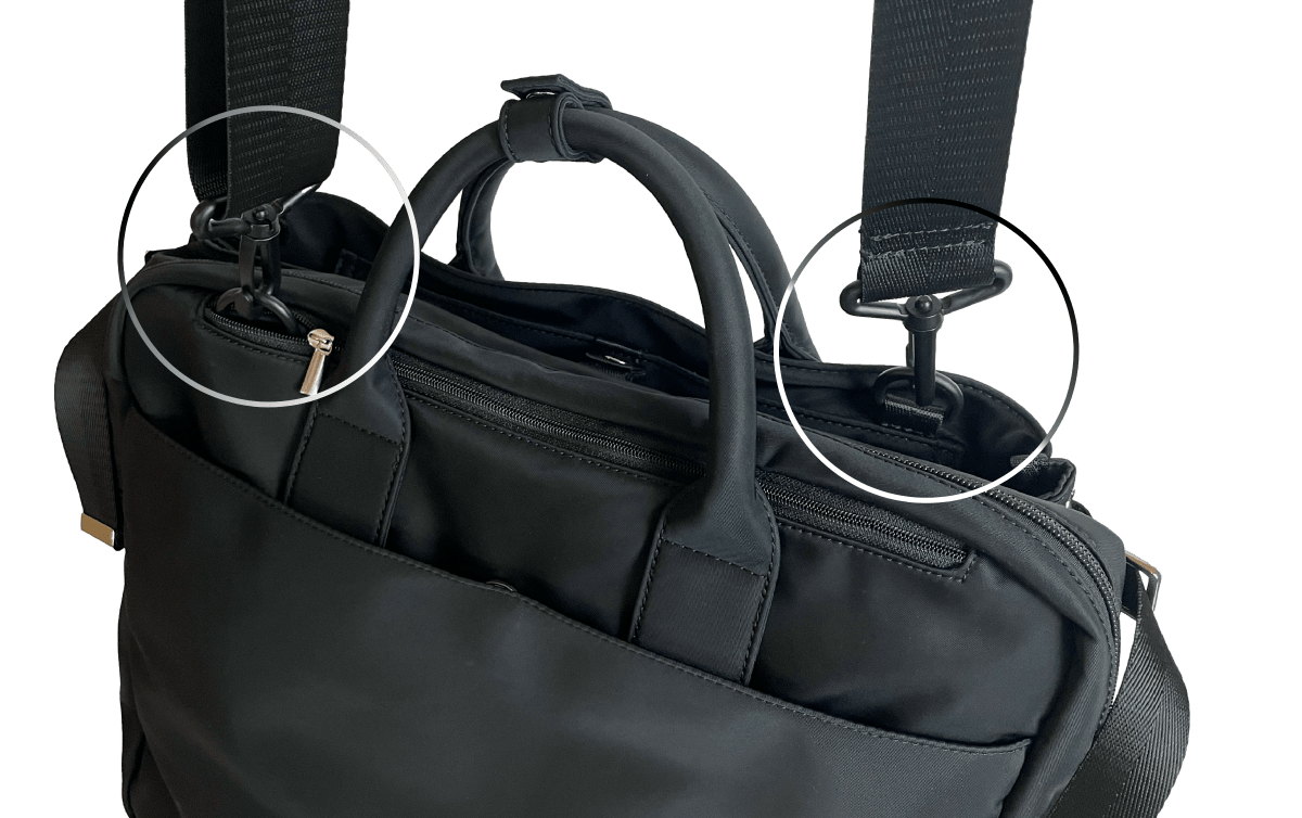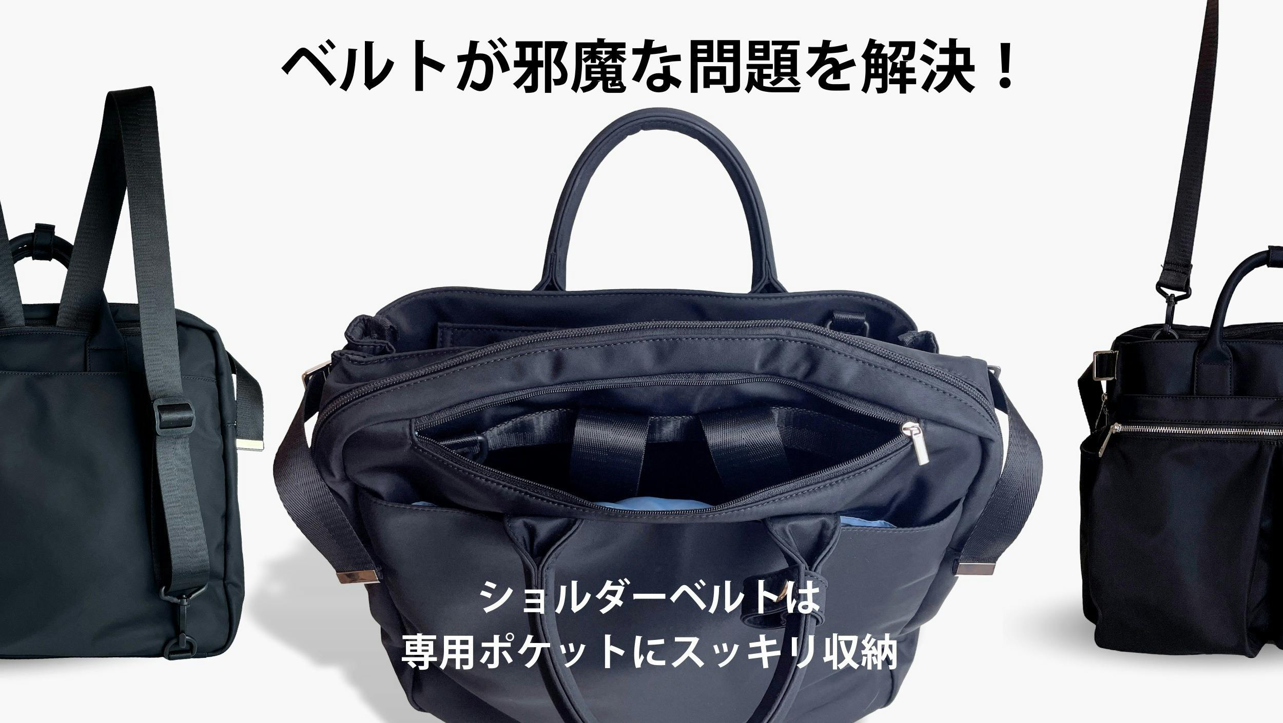 ショルダーバッグ用の片方のDカンはポケット内部に配置されており、もう一方のDカンを接続するだけで、簡単に取り付け・収納が行える設計になっています。