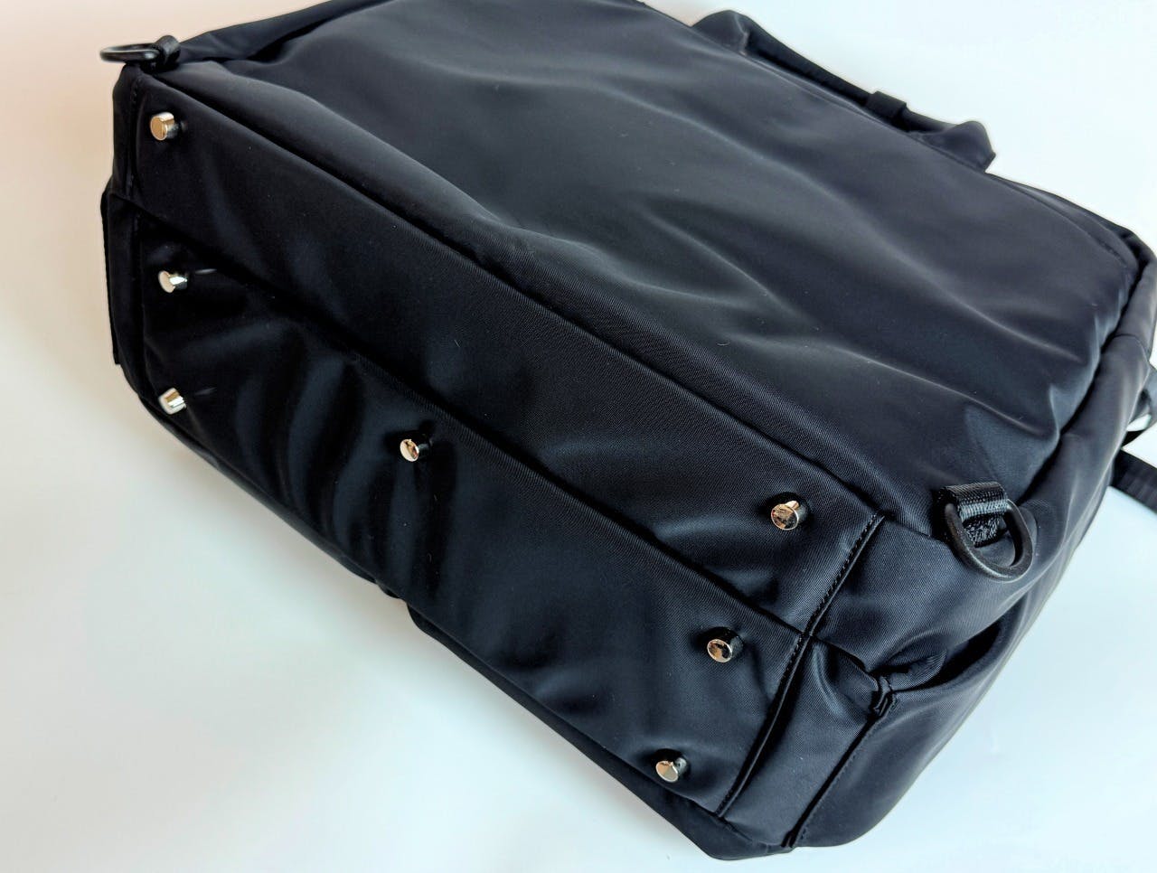 バッグを床に置いた時に底が汚れたり擦れたりするのを防ぐためメタルの底鋲を7カ所に付けました。