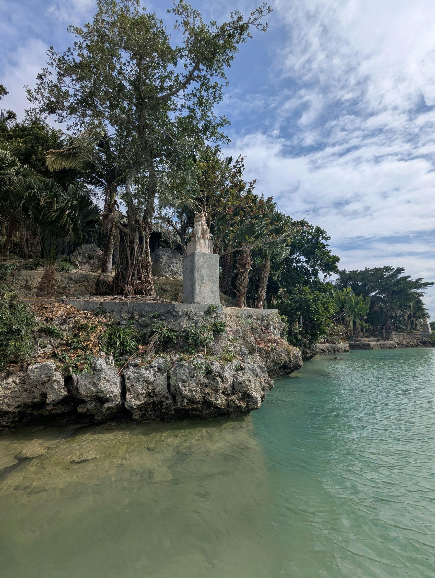 静かな水面を漕ぎ進み、自然のトンネルのような景色の中を進んでいくと、なんと!漕いで行かないと会えないシーサーに出会いました。