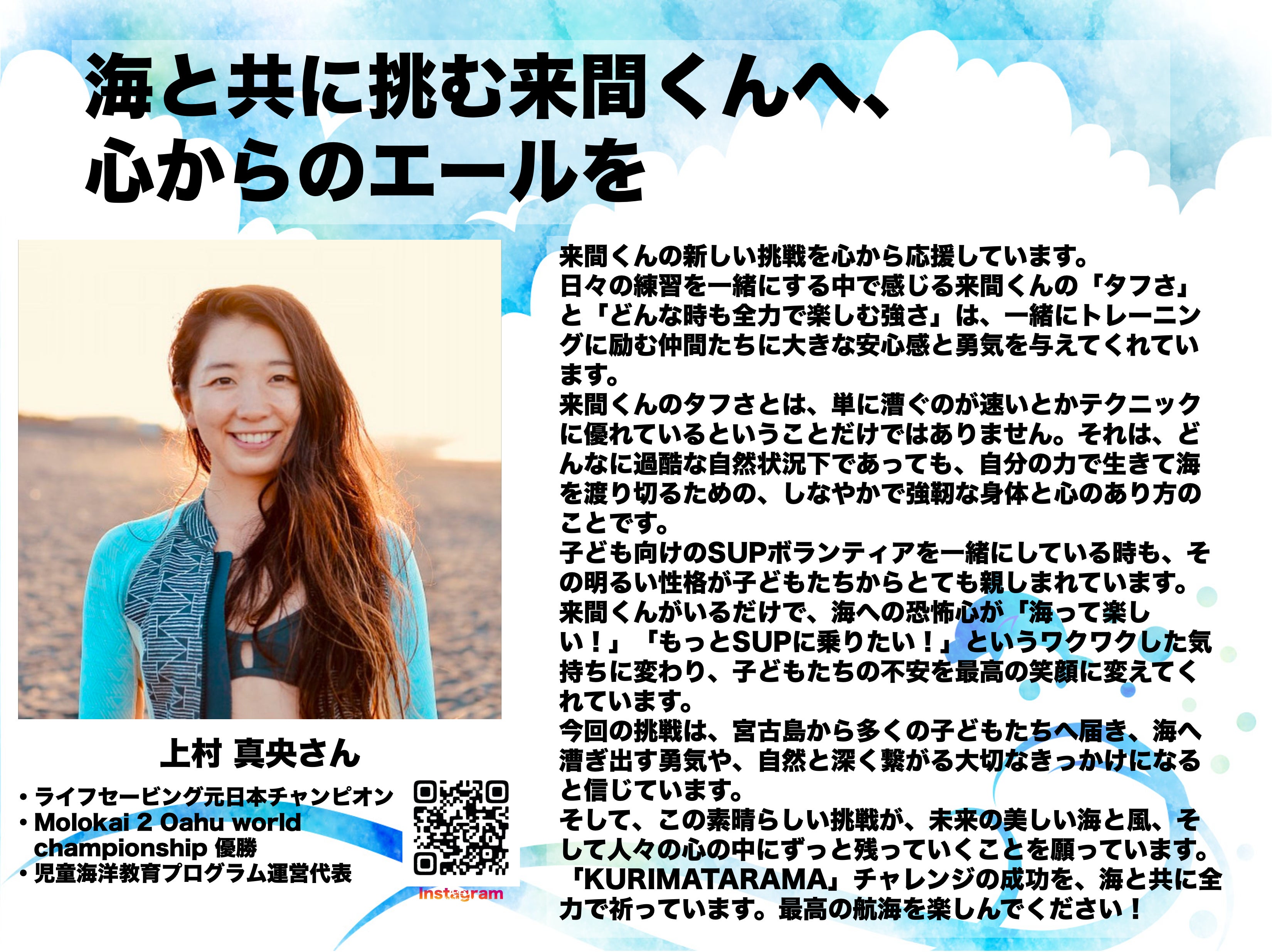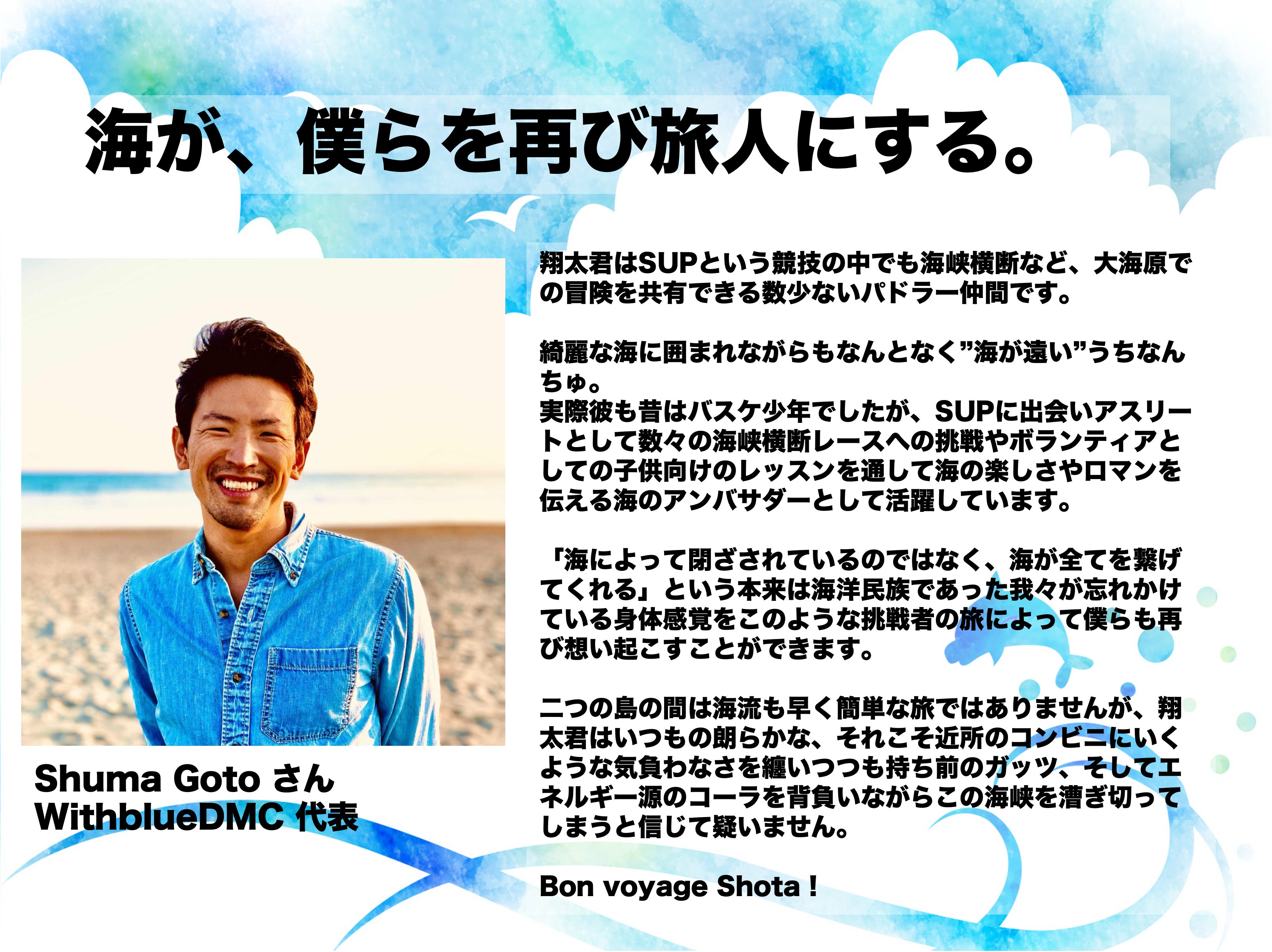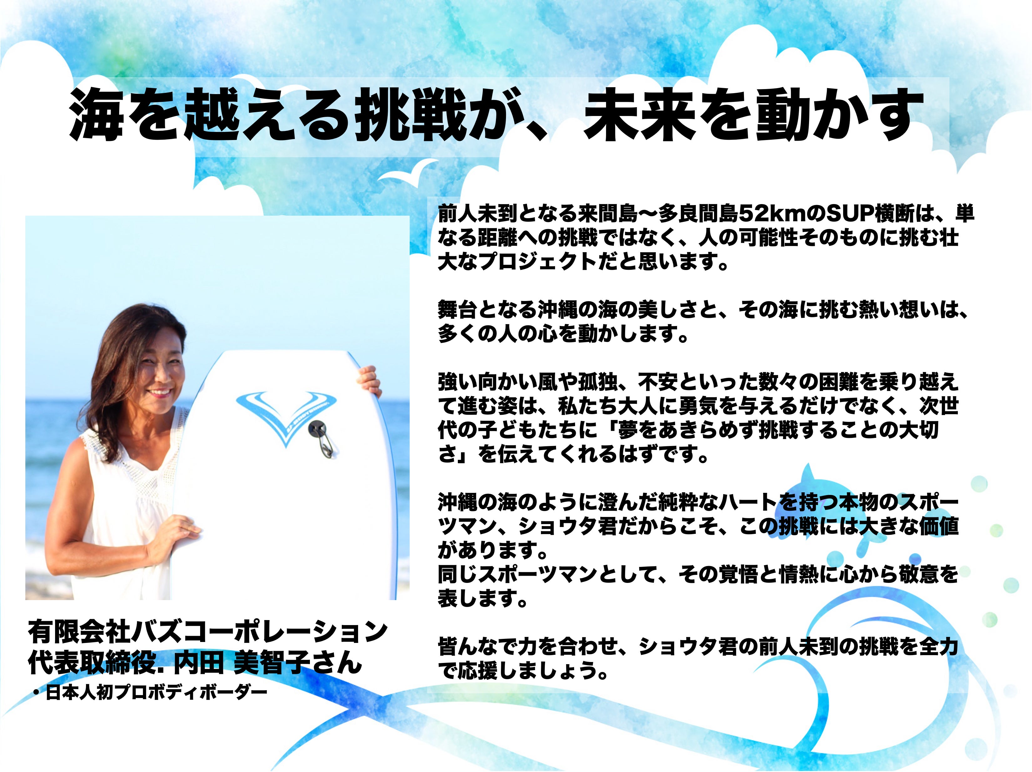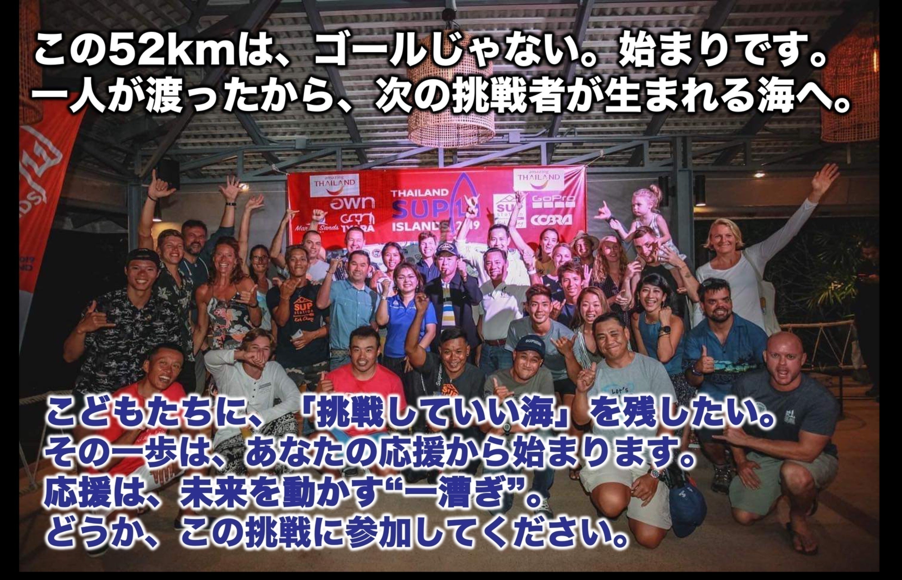 この挑戦は、支援してくれる人、応援してくれる人、そして、この海に想いを重ねてくれるすべての人と、一緒に渡る挑戦だと思っています。
