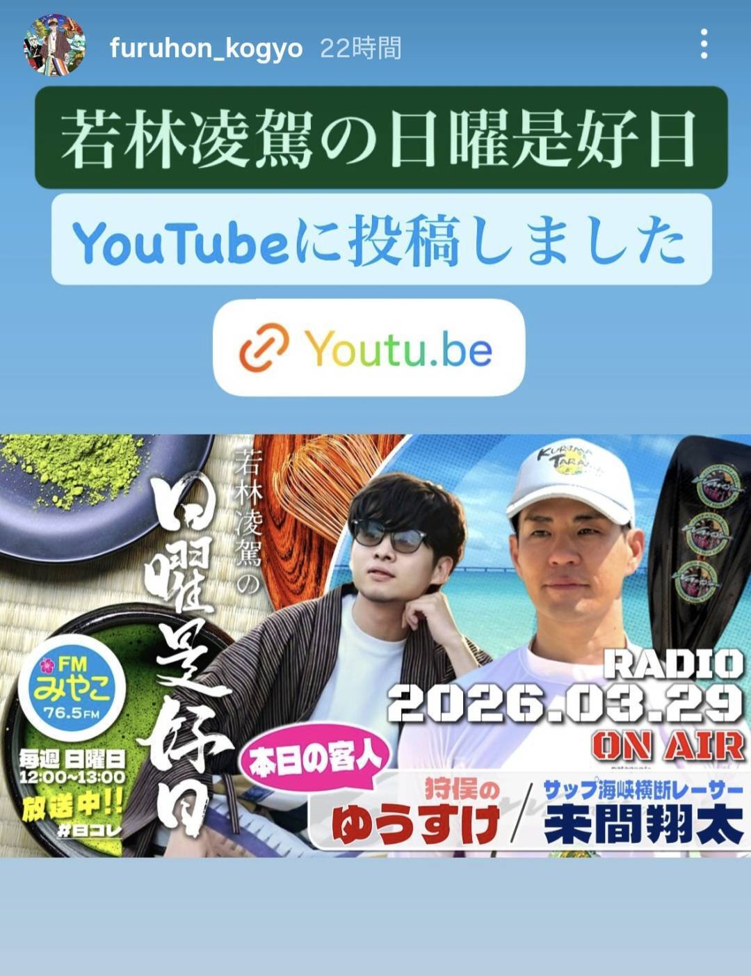 2026/03/31 17:28ご支援いただいている皆さまへ、心より感謝を込めてご報告いたします。このたび、FMみやこで若林凌駕さんがパーソナリティを務める「日曜是好日」に出演し、その様子が YouTube にて配信されています。番組では、凌駕さん、来間翔太、そして伴走船に乗りサポートクルーをしてくださった狩俣の ユースケさんの三人が登場し、挑戦の背景や宮古島の魅力を語りました。https://youtu.be/4aQ_IZQF3l0?si=LFTgacmBiIF2thozトークテーマ・凌駕さんとの出会い・SUPとの出会い・なぜKURIMA–TARAMA海峡横断に挑戦したのか・ユースケさんの魅力・宮古島観光大使を虎視眈々と狙う凌駕さんを全力応援艶っぽい声の凌駕さん、ハスキーボイスのユースケさん、万年鼻声の来間さんでお届けしています。日常のひとときに、家事や作業のBGMとして気軽にお楽しみください。 もっと見る