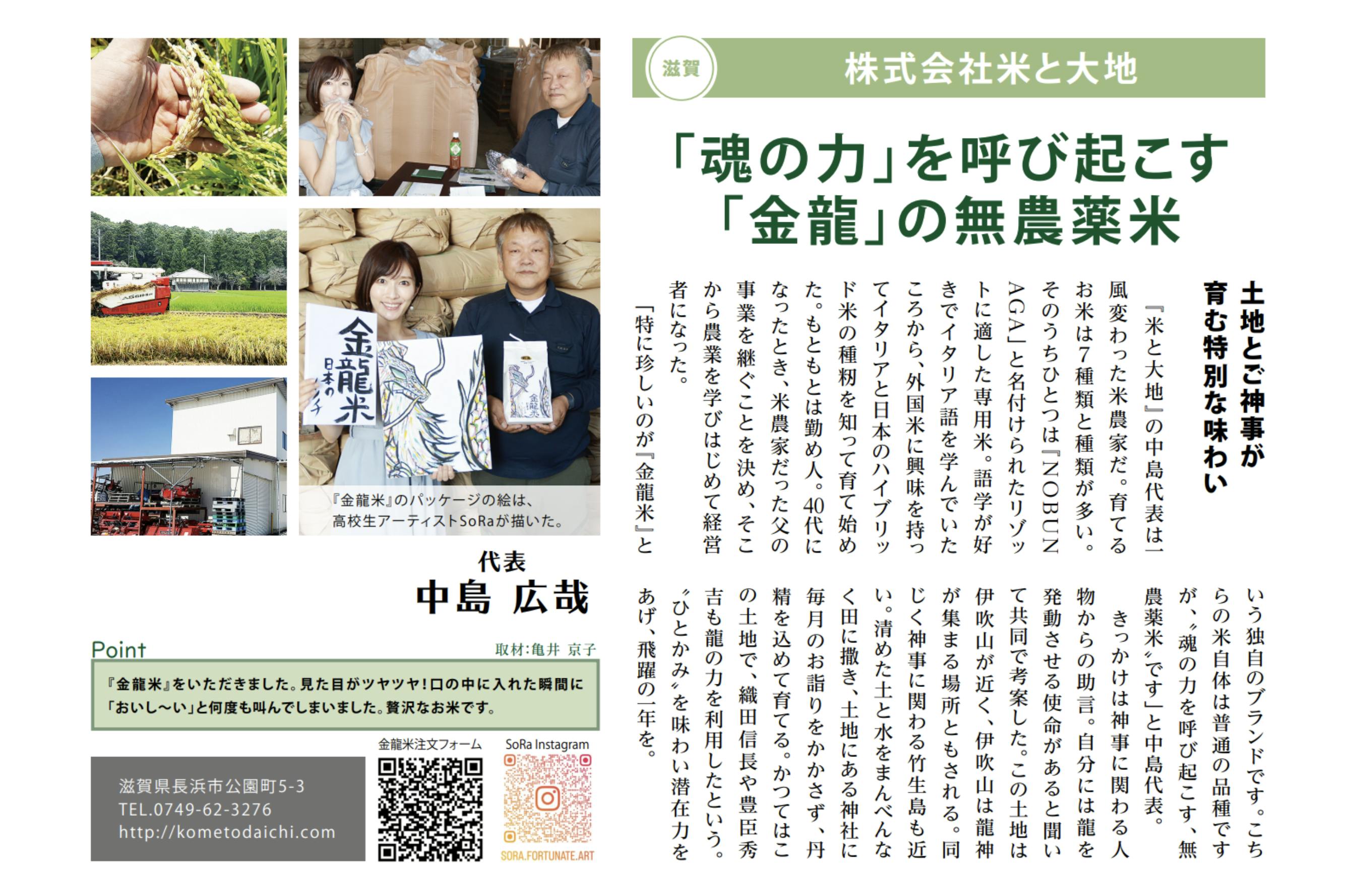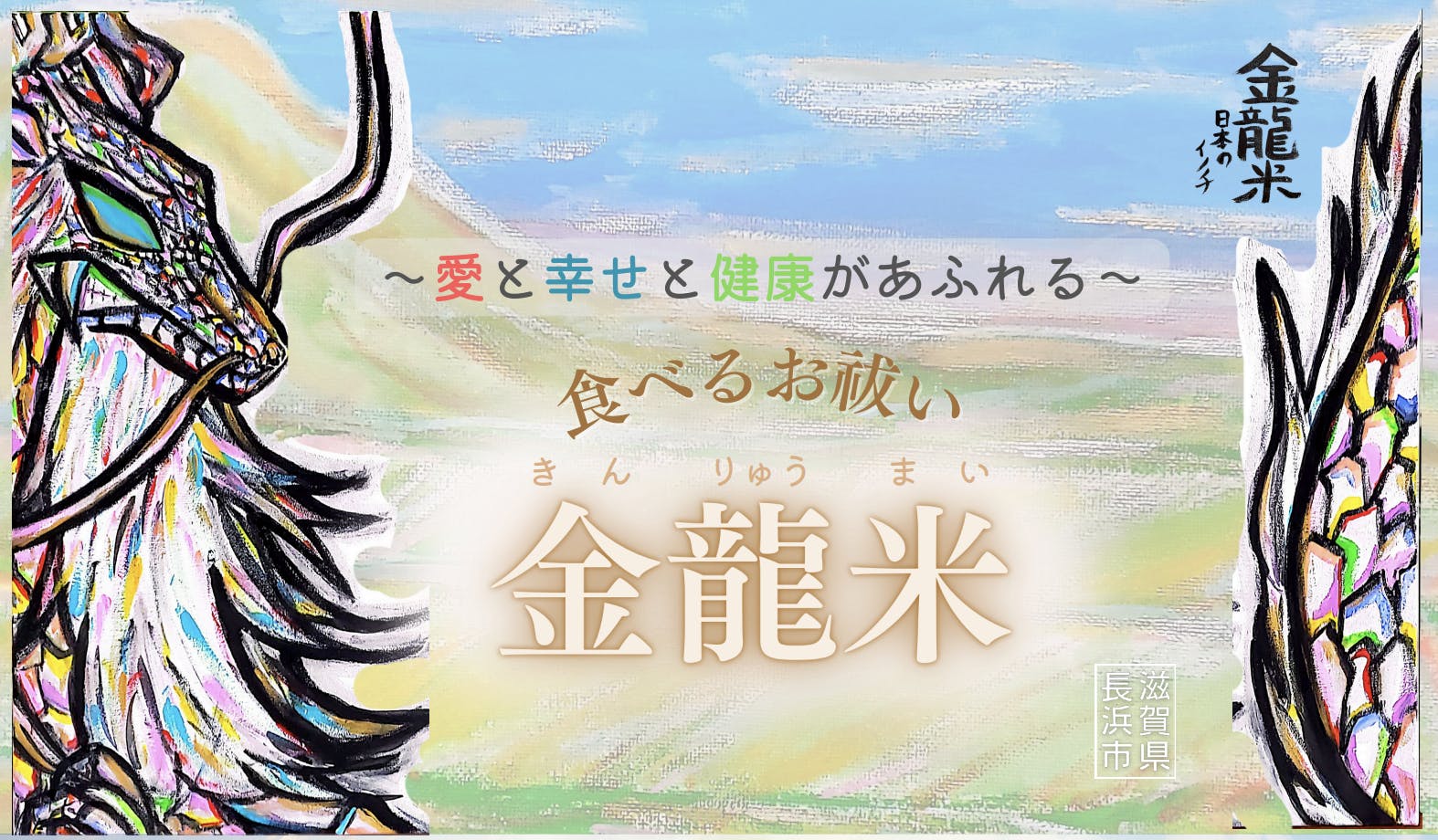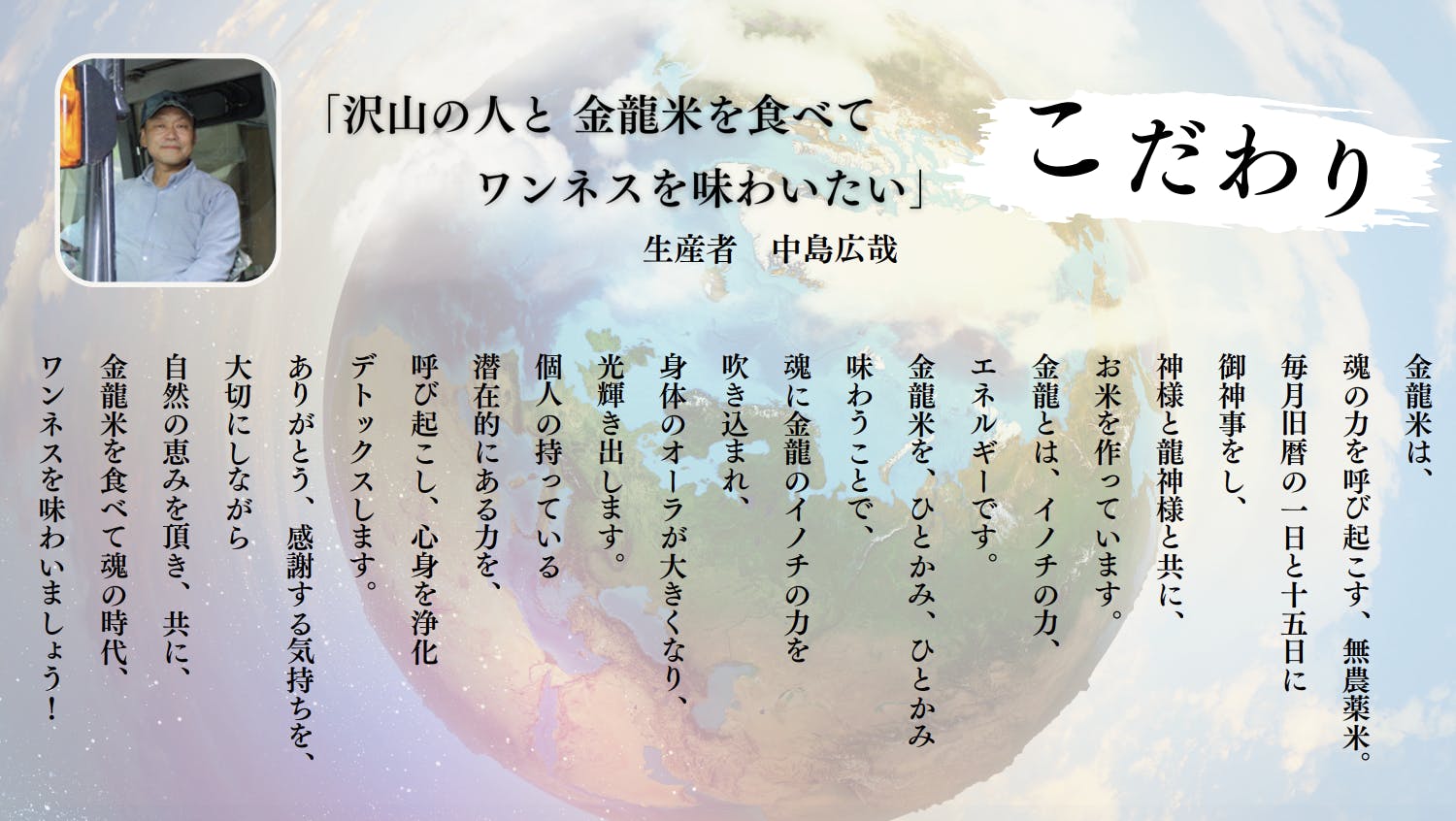 「たくさんの人と金龍米でワンネスを味わいたい」代々引き継いだ滋賀の美しい土地で、心身ともに健康に米作りができることだけでも幸せなのに、ご縁をいただいた方からのお力で、龍神のパワーをいただき、皆様にご提供できるようになったことに感謝の思いでいっぱいです。