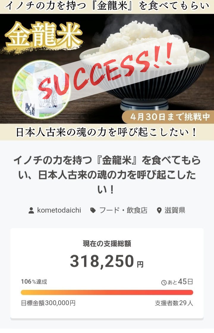 2026/03/16 19:48イノチの力を持つ『金龍米』を食べてもらい、日本人古来の魂の力を呼び起こしたい!を応援してくださる皆様へ 起案者の中島広哉です。 なんと、開始2日で目標の30万円を達成いたしました! ご支援、本当にありがとうございます。 皆様からの期待の大きさを感じ、身が引き締まる思いです。 そこで、この大きなご支援の波に乗って、次の目標(ネクストゴール)を50万円に設定します! プロジェクト終了の4月30日まで、さらなるご支援・拡散のご協力をお願いいたします! もっと見る