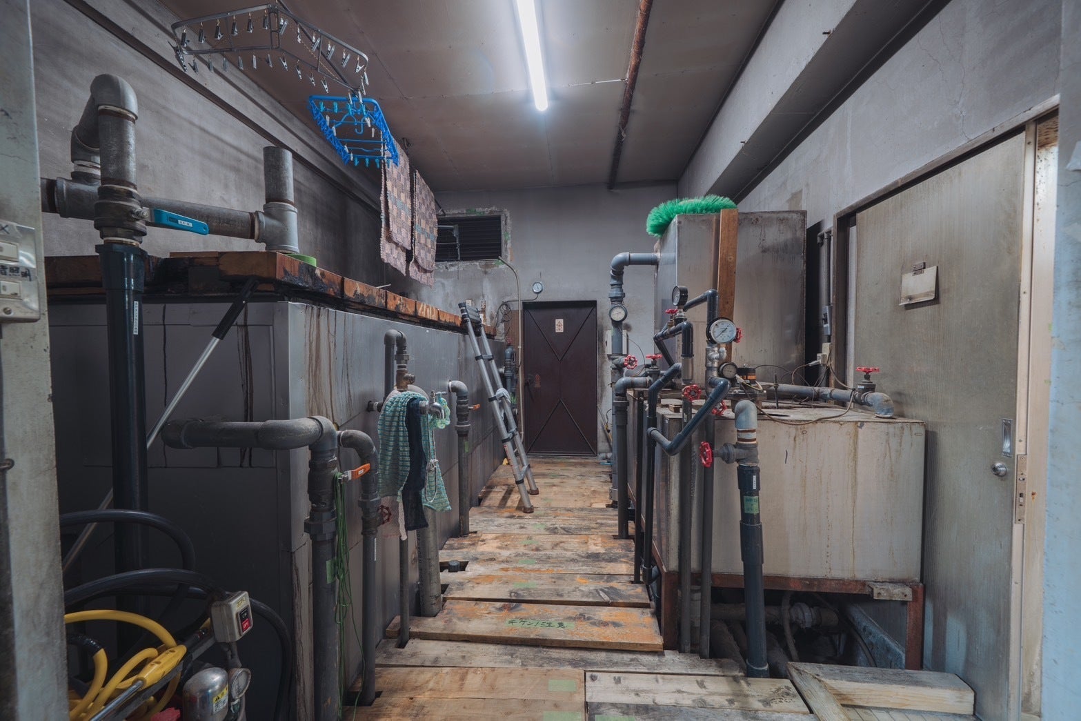 左の釜でお湯を沸かし、右側の設備で快適な温度に調節して浴室にお湯をお届けしていました。なかなか見られない銭湯の裏側を、今回特別に公開です!