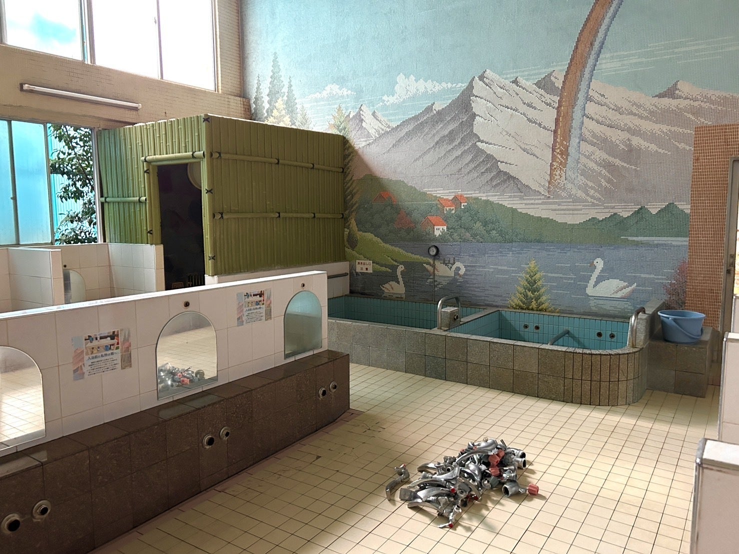 こちらは営業終了翌日の姿です。役目を終えたシャワーやカランが一足先に壁から取られました。翌日から工事に向けての片付けがドタバタだったのですが、この姿を見た時、最後の営業が終了したことを改めて実感しました。長い間、本当にお疲れ様。