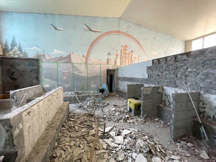 解体工事では最終的には浴室の男女間の仕切りの壁も壊されて何も無い空間に!仕切りが無くなったことで、普段は全貌を見ることの出来ないタイル絵を一望出来るように。