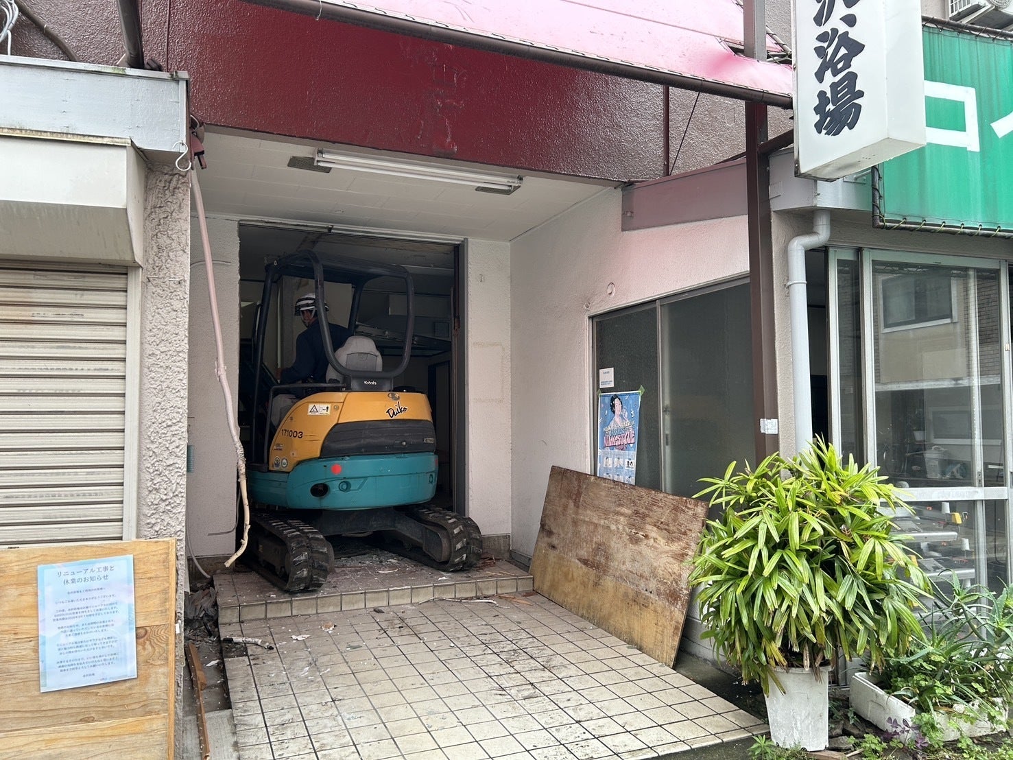 なんと入り口からショベルカーが、、!こんな風景なかなか見られませんね。脱衣所だった部分も全て壊して作り直していきます。