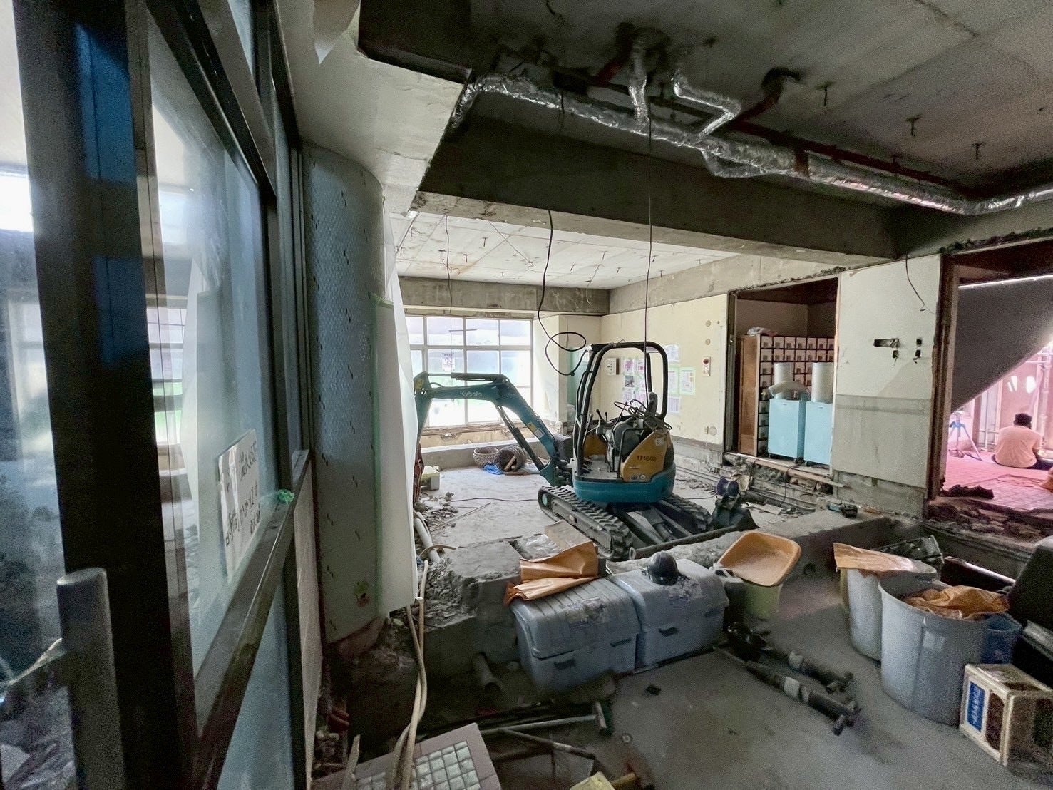 工事はいよいよ本格的な解体作業に!タイルが剥がされて徐々にコンクリートが剥き出しに。なかなか見ることができない銭湯の素の姿を収めた貴重な一枚です。