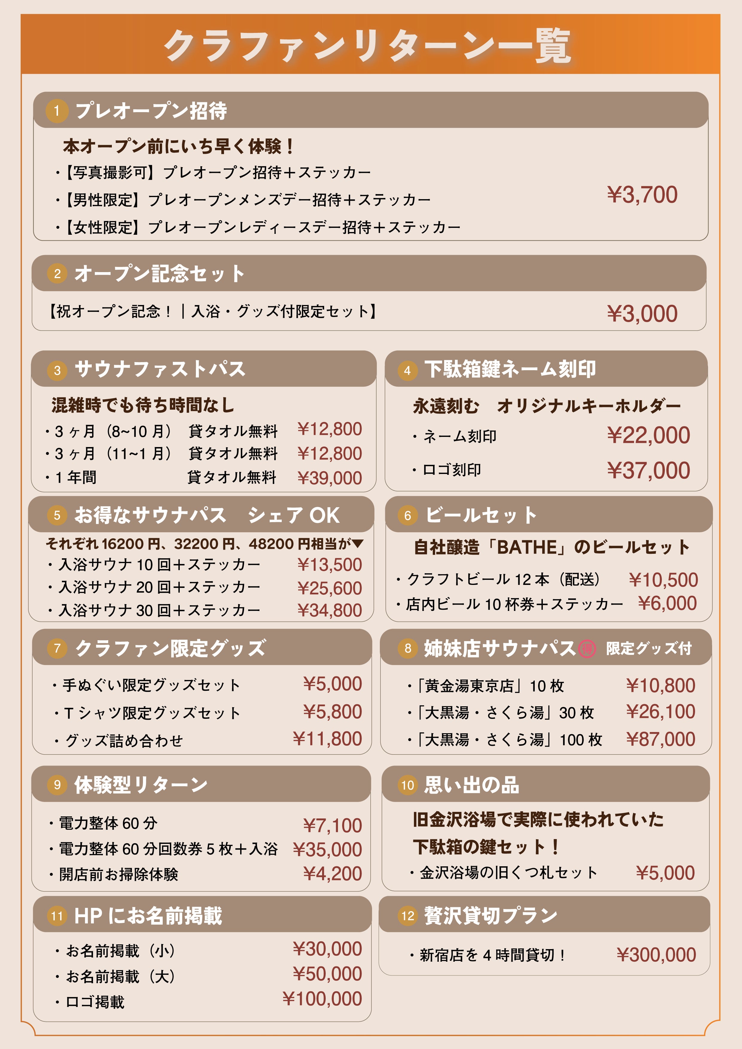 リターン品には、この機会にしか手に入らない特別なクラファン限定グッズの数々や、お得なご利用チケットなど、様々なものをご用意しました!黄金湯 新宿店の完成を皆様と一緒に盛り上げて行ければ幸いです。