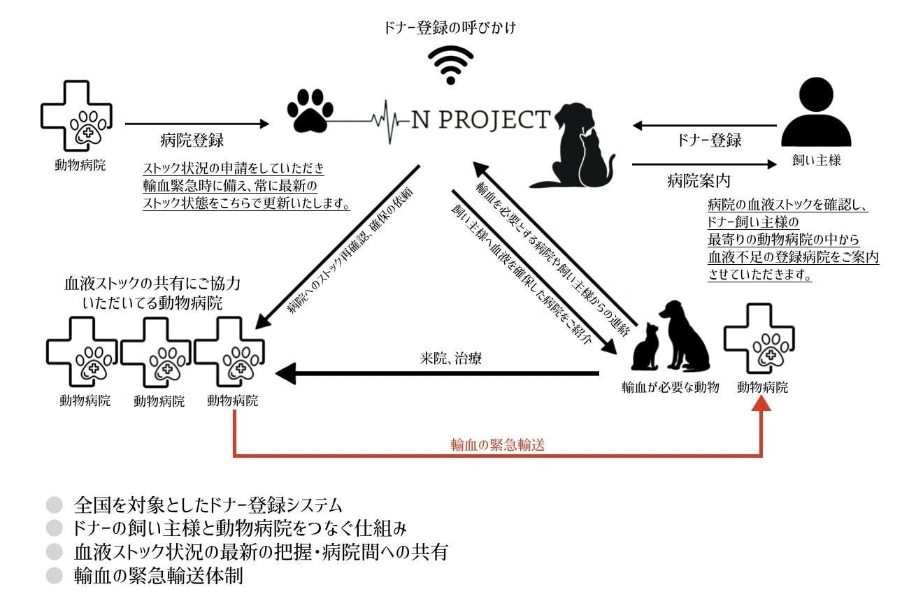 2026/02/24 11:00プロジェクト実現の今後この事業は輸血を必要とする動物のためのプロジェクトです。輸血が必要であるにもかかわらず血液やドナーが確保できず、救えるはずの命が救われない現実を変えるために立ち上げました。現在の日本では専用の動物血液バンクが十分に整備されておらず、主に動物病院や登録機関で、健康なワンちゃんや猫ちゃんからの「血液の寄付」によって支えられています。しかし血液ストックは常に不足しており、怪我や病気で輸血を必要としている動物の飼い主様が、SNS等で供血犬を探される投稿を多く目にします。大切なご家族が輸血を必要としている緊急事態の中でドナーを探すことは時間的にも精神的にも大きな負担となります。そんな時にこのサービスを利用していただきたいという想いから立ち上げたのが「N PROJECT」です。全国を対象とした動物のドナー登録システムを構築し、飼い主様と動物病院をつなぐことで、必要なときに必要な場所へ血液を届けられる体制の確立を目指しております。また、血液ストック情報の共有や輸送体制の整備を通じて、動物医療における日本赤十字社のような基盤づくりを目標としています。今後のプロジェクト実現に向けて、まずは法人化を行い、事業基盤の整備と信頼性の確立を進めてまいります。その後、協力動物病院様の募集・提携、ドナー登録システムの開発、血液ストック管理データベースの構築を段階的に実施予定です。事業内容まず、血液ストックの共有にご協力いただける動物病院様、動物を飼われている飼い主様、ドナーとしてご協力いただける飼い主様に登録をしていただきます。全国の動物病院様にある血液ストックを本システムで一元管理し、輸血が必要になった際に飼い主様からご連絡をいただくことで、最寄りの病院に血液ストックがあるかを迅速に確認いたします。飼い主様が移動可能な距離であれば、該当する動物病院様へ血液の確保を依頼し、円滑な輸血につなげます。また、距離や緊急度に応じて血液の輸送にも対応できる体制を整備してまいります。ドナー登録をしていただいた方には、お住まいの地域周辺で血液ストックが不足している動物病院様をご案内し、必要なときに迅速な協力ができる仕組みを構築します。本プロジェクトは、輸血を必要とするすべての動物とそのご家族が、安心して医療を受けられる社会を実現するための基盤づくりです。皆様からのご支援をもとに、着実に形にしてまいります。 もっと見る