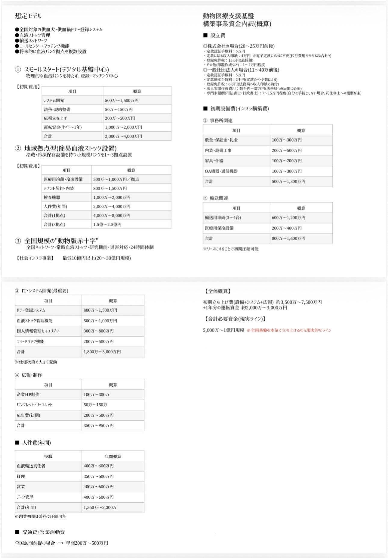 2026/02/25 12:00事業資金の概算について現在構想している「動物医療支援基盤(輸血ネットワーク)」の事業モデルと、必要となる資金の概算をまとめました。本プロジェクトは段階的に構築していく計画で、まずは大きな設備を持たない"スモールスタート"から始め、将来的に地域拠点・全国規模の体制へと発展させていきます。---------------‐-----------------■ スモールスタート(初期段階)まずは物理的な血液バンクを持たず、ドナー登録・マッチングを中心としたデジタル基盤から開始します。【初期費用目安】・システム開発:約500万〜1,500万円・法務・規約整備:約50万〜150万円・広報立ち上げ:約200万〜500万円・運転資金(半年〜1年):約1,000万〜2,000万円▶ 合計:約2,000万〜4,000万円---------------‐-----------------■ 地域拠点型(次のステップ)冷蔵・冷凍設備を備えた小規模拠点を1〜3箇所設置し、実際の血液ストック体制を整備します。【1拠点あたり】・医療用冷蔵・冷凍設備:500万〜1,000万円・検査機器:1,000万〜2,000万円・人件費(年間):2,000万〜4,000万円▶ 1拠点合計:4,000万〜8,000万円---------------‐-----------------■ ITシステム開発(最重要基盤)・ドナー登録管理・血液在庫管理・セキュリティ管理・マッチング/フィードバック機能▶ 合計:約1,800万〜3,800万円---------------‐-----------------■ 初期立ち上げ総額(概算)設備・システム・広報などを含め約3,500万〜7,500万円さらに安定運営のための運転資金として約2,000万〜3,000万円を想定しています。---------------‐-----------------■ 現実的な必要資金ライン本格的に全国基盤として構築する場合、約5,000万円〜1億円規模が現実的な目安となります。---------------‐-----------------最後にこの金額は大きく見えるかもしれません。ですが、これは「救えるはずの命を救うための医療インフラ」をゼロから作る挑戦です。まずは小さく始め、確実に実現させながら段階的に拡張していく計画です。皆さまのご支援が、この第一歩を現実に変える力になります。引き続き応援をよろしくお願いいたします。 もっと見る