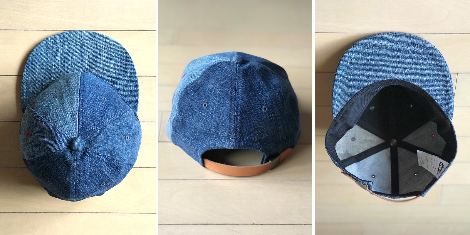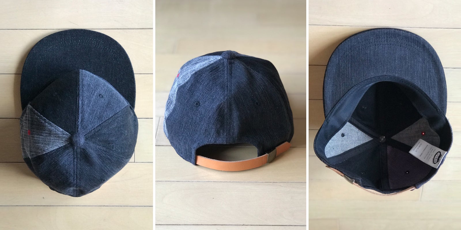 ベーシックな6パネルベースボールキャップとバケットハットの2つのスタイルを用意しました。インディゴブルー系の古着デニムを切り出したパターンと、限定数でブラックデニム系を使ったパターン。そして、商品サンプルとして使われ行き場のなくなっていたレザーアイテムを切り出してつくったレザーバージョンを数量限定で用意しました。