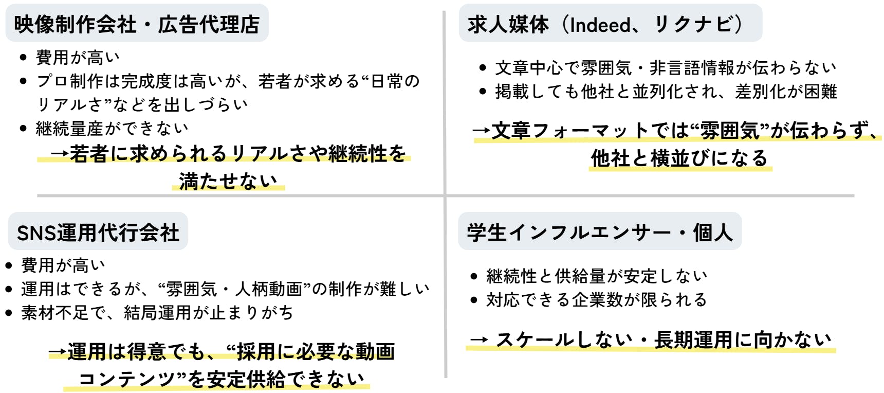 既存の解決策は、それぞれに強みがある一方で、採用において重要な「若者が知りたい情報を、継続的に届ける仕組み」という点では共通した課題を抱えています。
