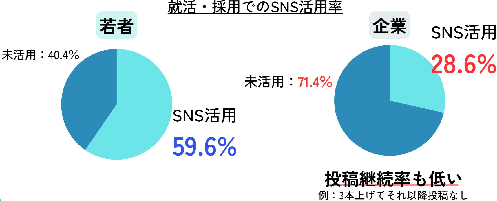 一方で、企業側の採用活動におけるSNS活用率は28.6%にとどまっています。若者の多くが日常的にSNSを利用している一方で、企業の採用活動におけるSNS活用は十分とは言えず、若者が情報を得ている主要な場に、企業の半分以上がリーチできていないという課題が生じています。