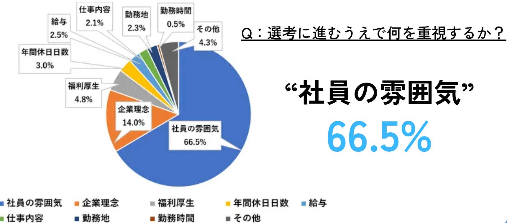 若者が企業選びで重視しているのは、給与や勤務地といった条件面だけではありません。66.5%の若者が「職場の雰囲気」を重視していると言われています。