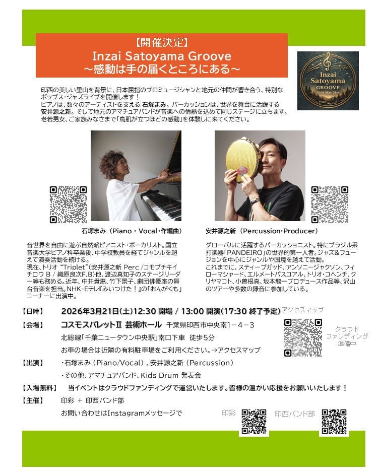 印西の美しい里山を背景に、日本屈指のプロミュージシャンと地元の仲間が響き合う、特別なポップス・ジャズライブを開催します!