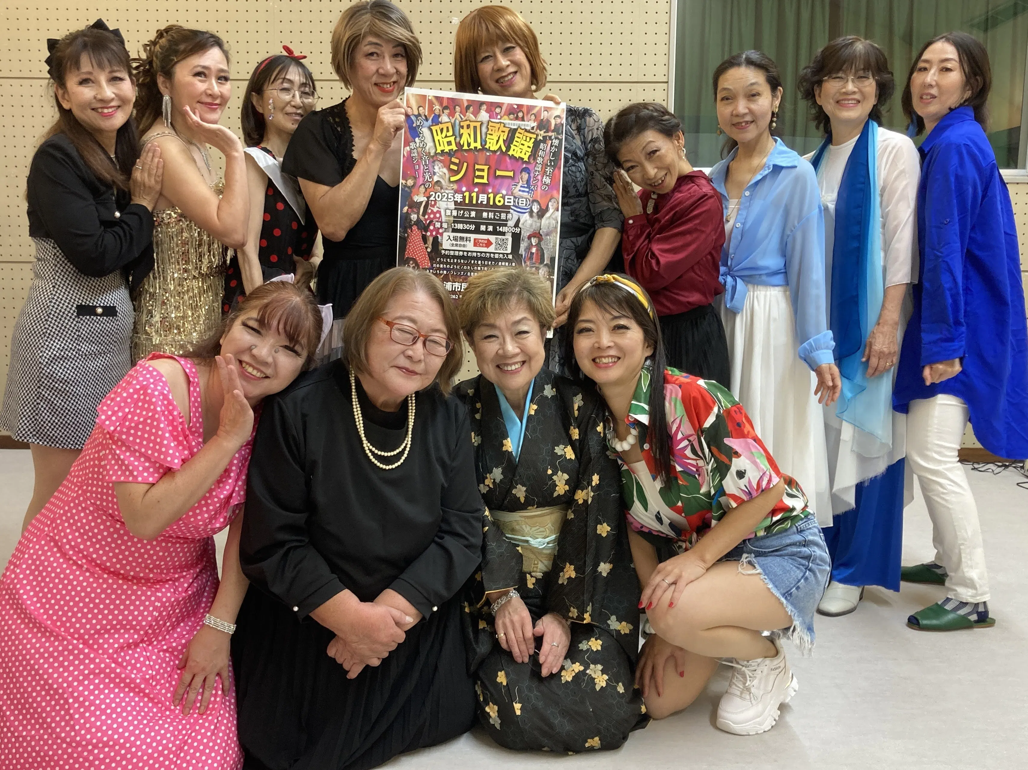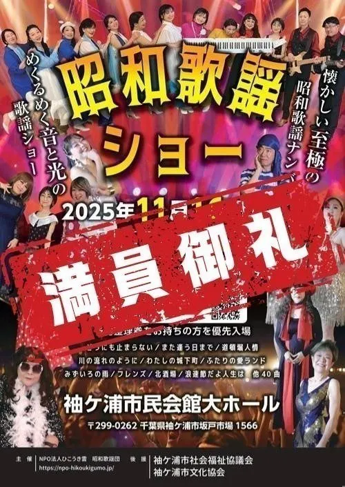 昭和から令和へと時代をつなぐ取り組みとして、2025年11月16日、袖ヶ浦市市民会館大ホール(収容人数620名)において、昭和歌謡ショーの旗揚げ公演(無料)を開催いたしました。当日は420名の方にご来場いただき、会場は大きな拍手と歓声に包まれ、公演は大成功のうちに終了することができました。公演を通じて、演出・構成・音響・照明の完成度を高め、昭和歌謡ショーは内容的にも確立された、見応えのある公演型ショーを確立しています。