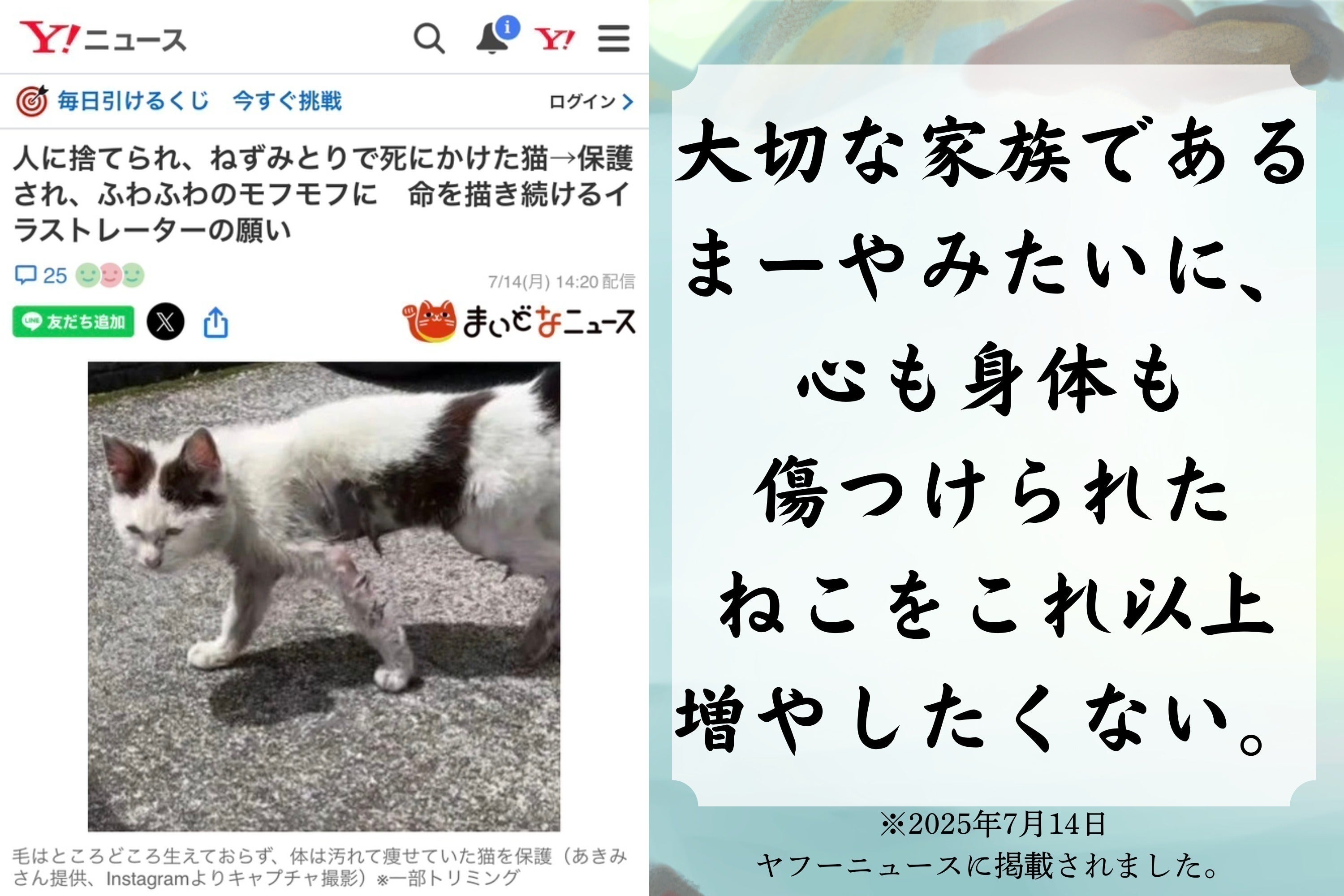 私自身2024年5月、元捨てられ猫で身体の一部に皮膚がなく、誰にも愛されなかったねこ「まーや」を保護し家族に迎えました。 ねずみ捕りにやられても、ミミズやイモリを食べて必死に生きてました。