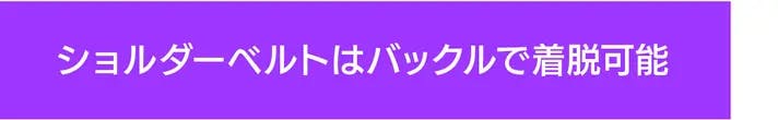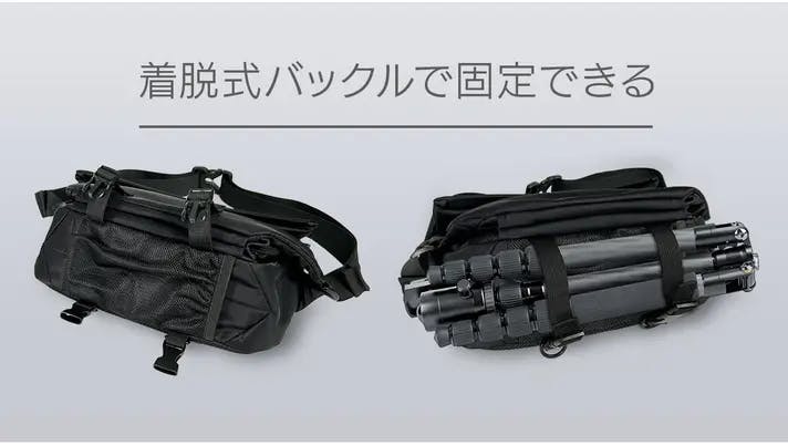 2つのバックルでテープを締め付けて固定できます。バックルは着脱できるのでミニ三脚や薄手の洋服をかけられることも可能。