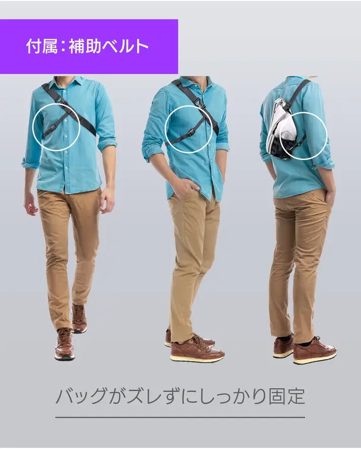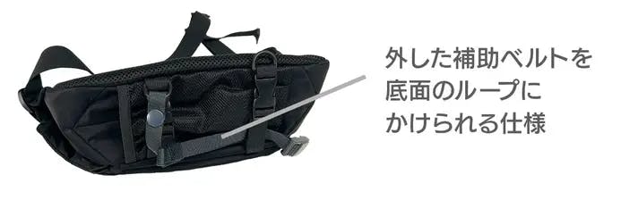 バッグのズレを防止する補助ベルトが付属。自転車での移動や激しい動きの際にもバッグをしっかり固定可能です。
