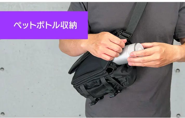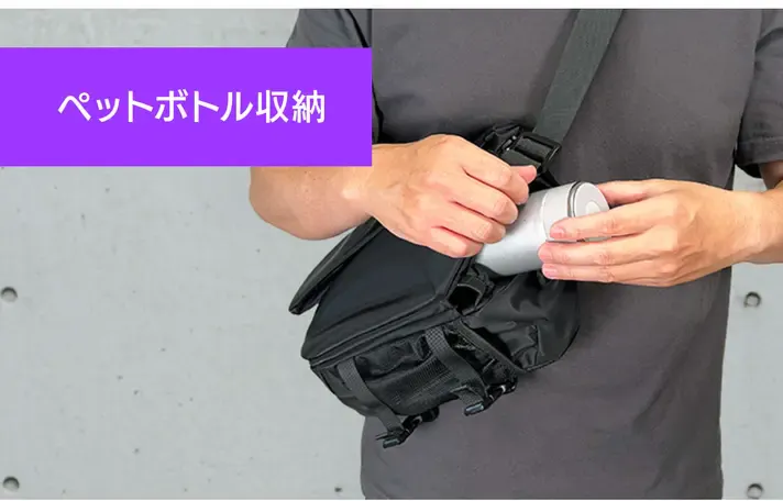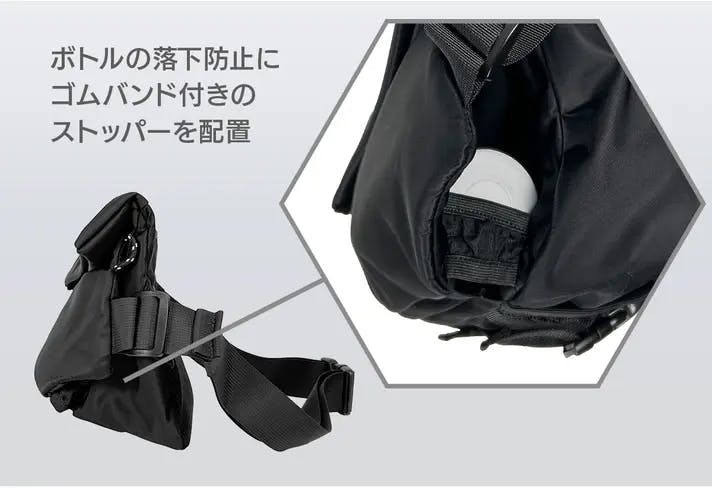 マイボトルやペットボトルを収納可能な専用スペースを配置。本体サイドのスリットから出し入れする構造でスムーズにアクセス可能です。又、収納口のゴムバンド付きのストッパーでボトルの落下を防止します。